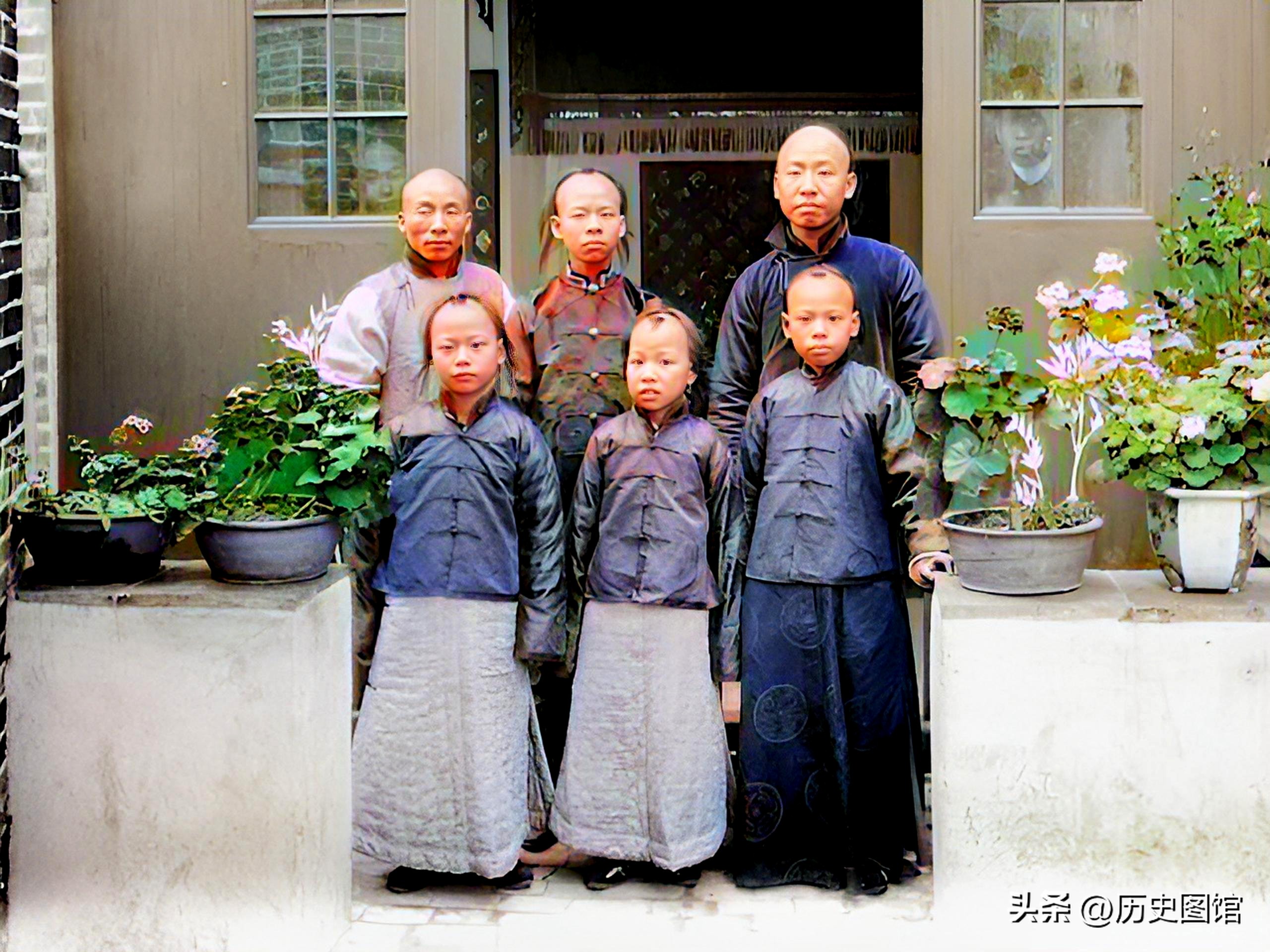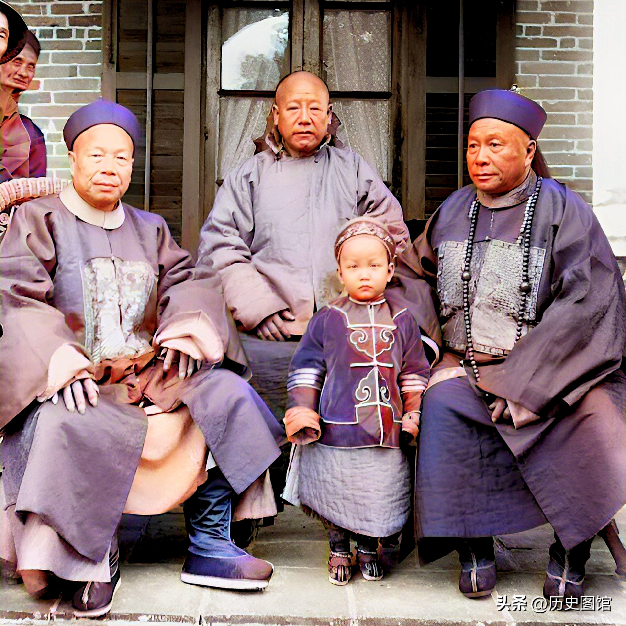 清朝末年,阳江当第一户人家的合影。看起来像是祖孙三代。站在左边是一对夫妻,旁边是母亲,最右边的应该是她的孙子。