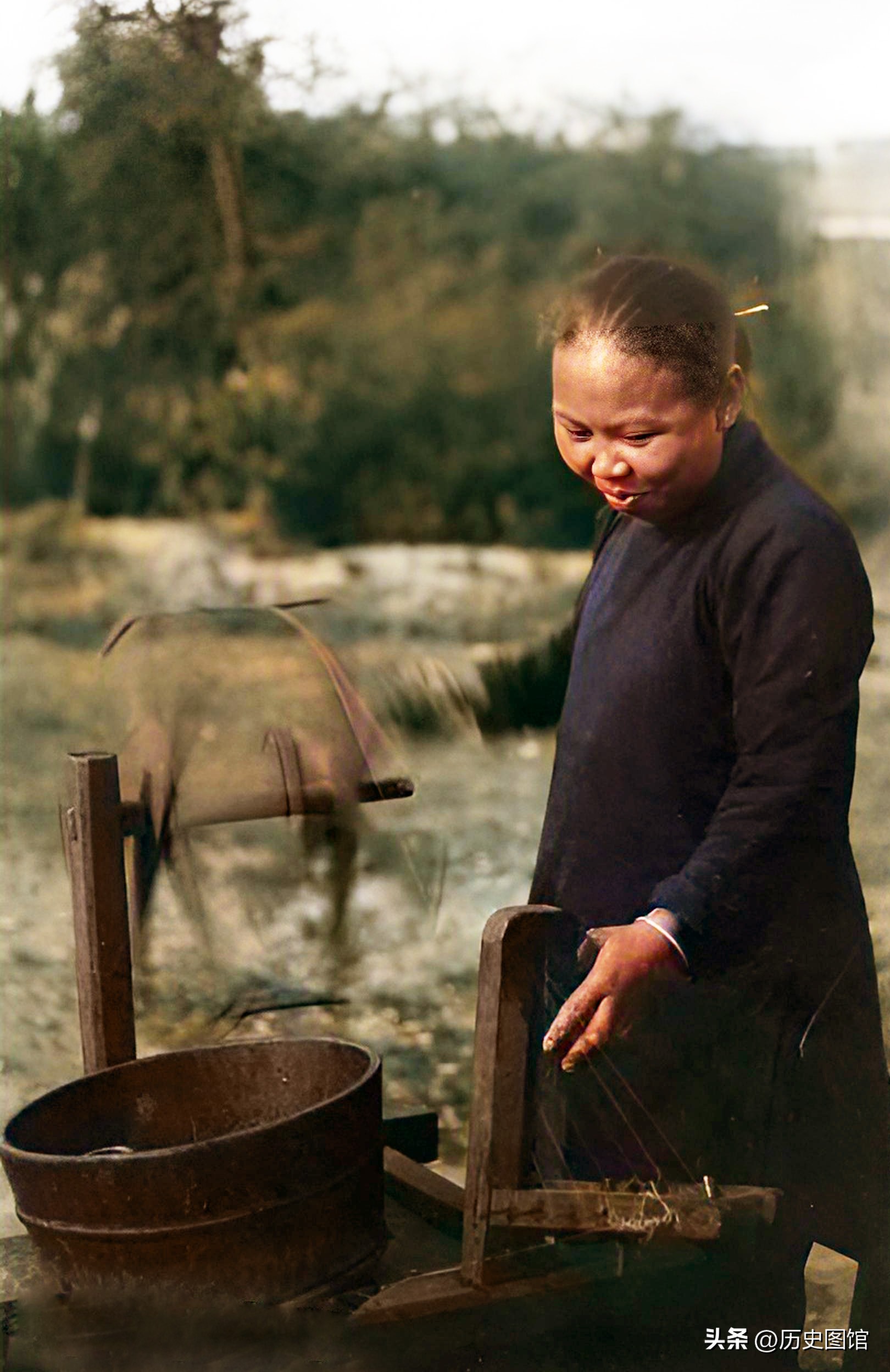 在这张照片里,一名女子挑着扁担从街头走过。仔细看,她头上戴的就是这种像倒扣的锅一样的帽子。想必是只有女性才能戴这样的帽子吧。