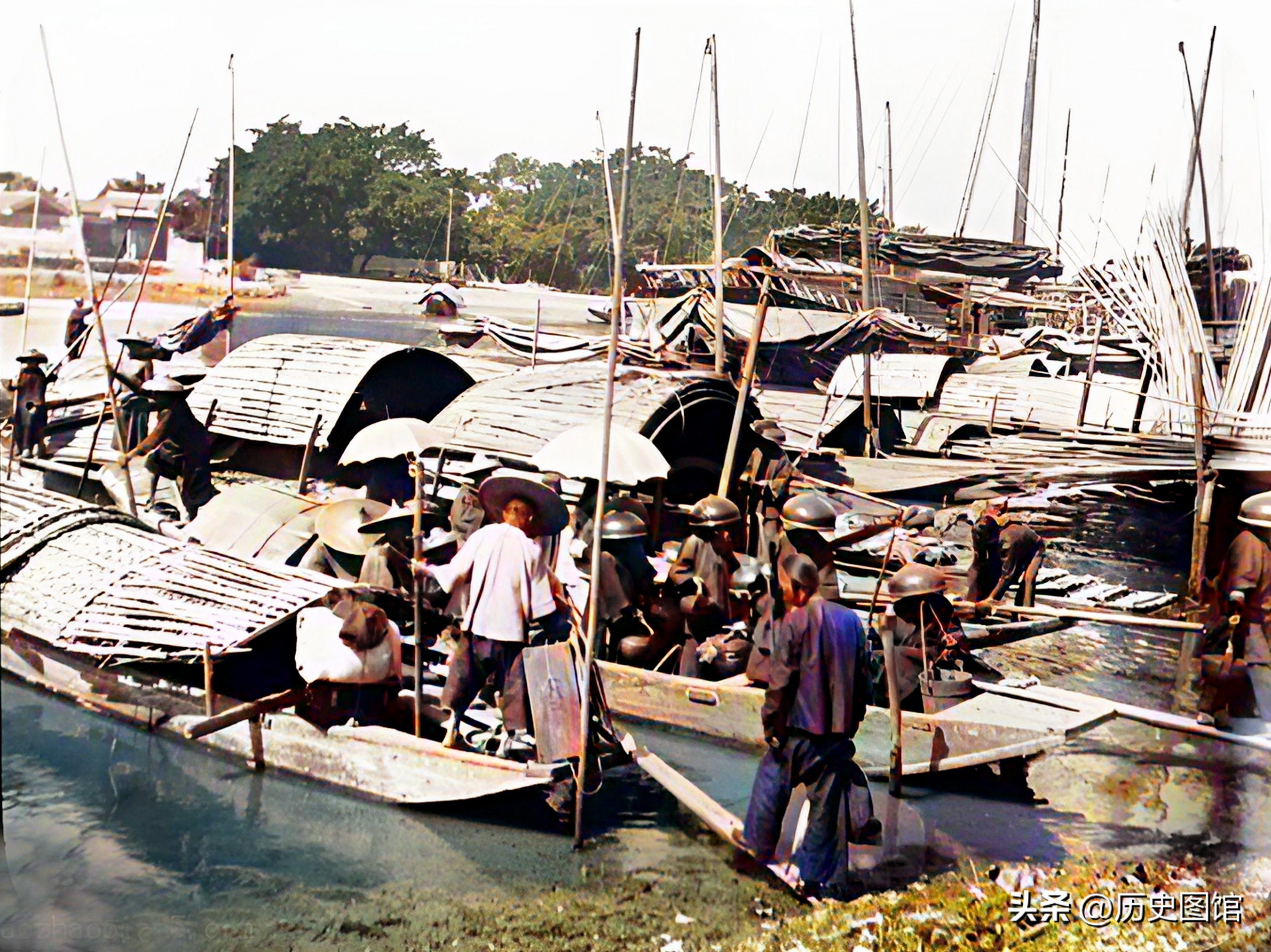 阳江是一座滨海城市,人们出行很多时候要乘船。照片中,码头上停着很多摆渡的小船,船上带有棚子。仔细看,几名乘客头上戴着像倒扣的锅一样的帽子,而且都是女性。