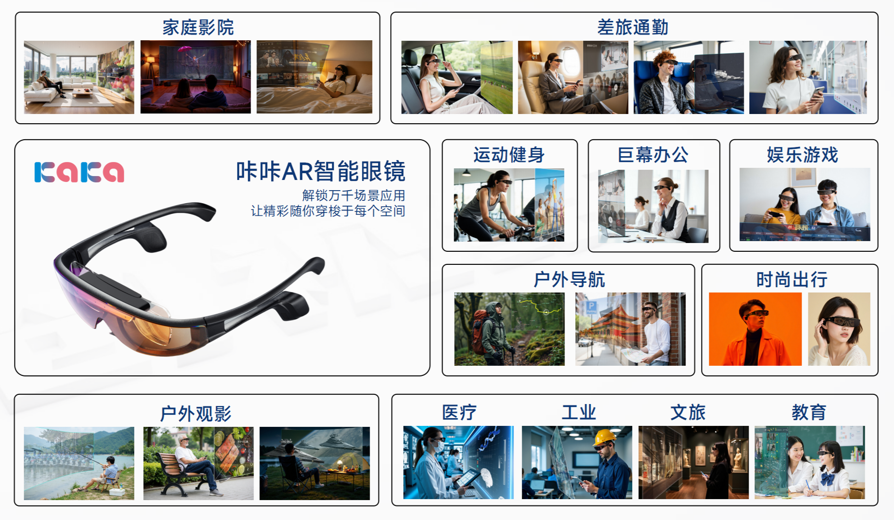 咔咔AR智能眼镜不仅可满足普通消费者在影音娱乐、日常通勤等场景的需求,虚拟大屏带来沉浸式观影体验;