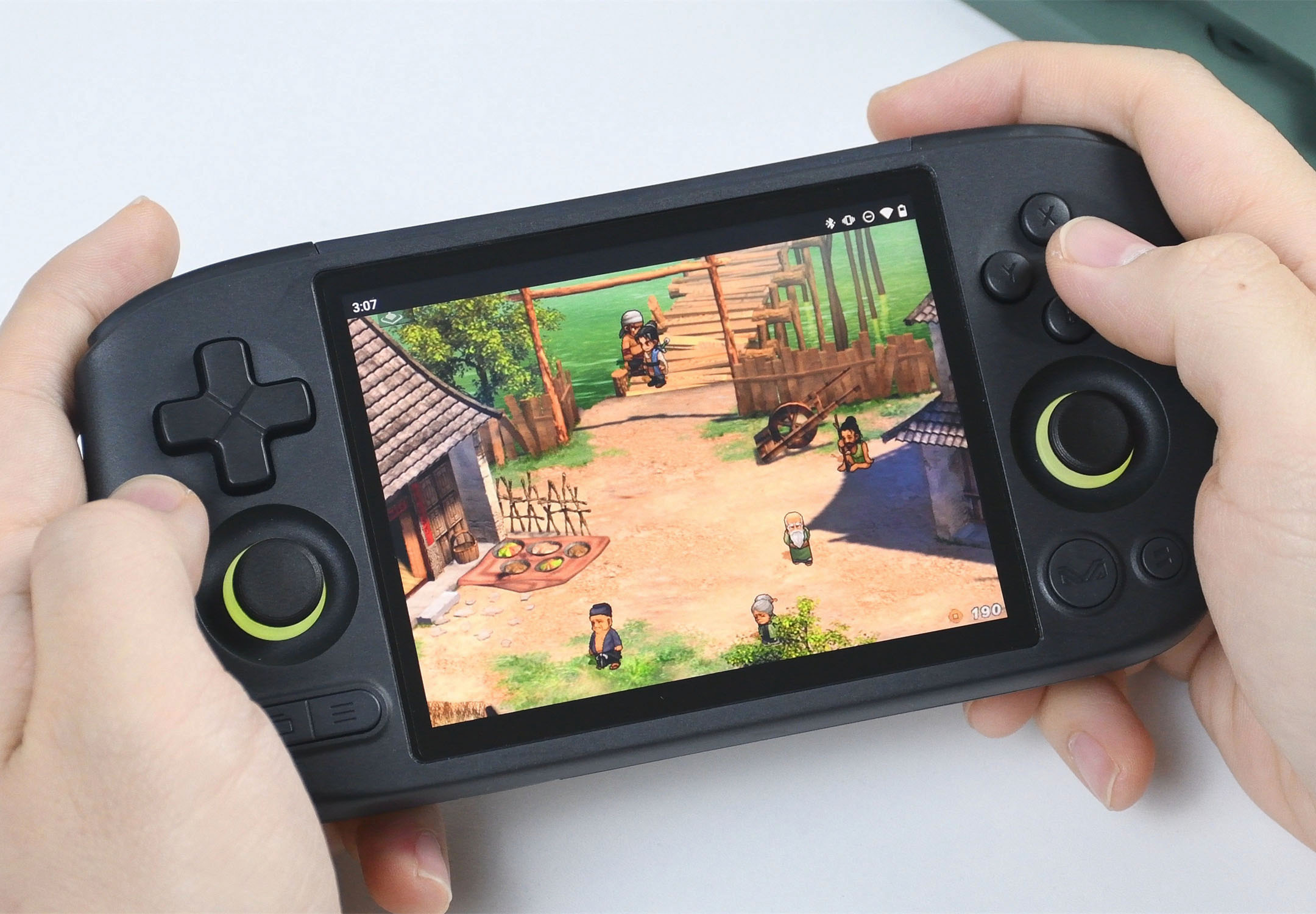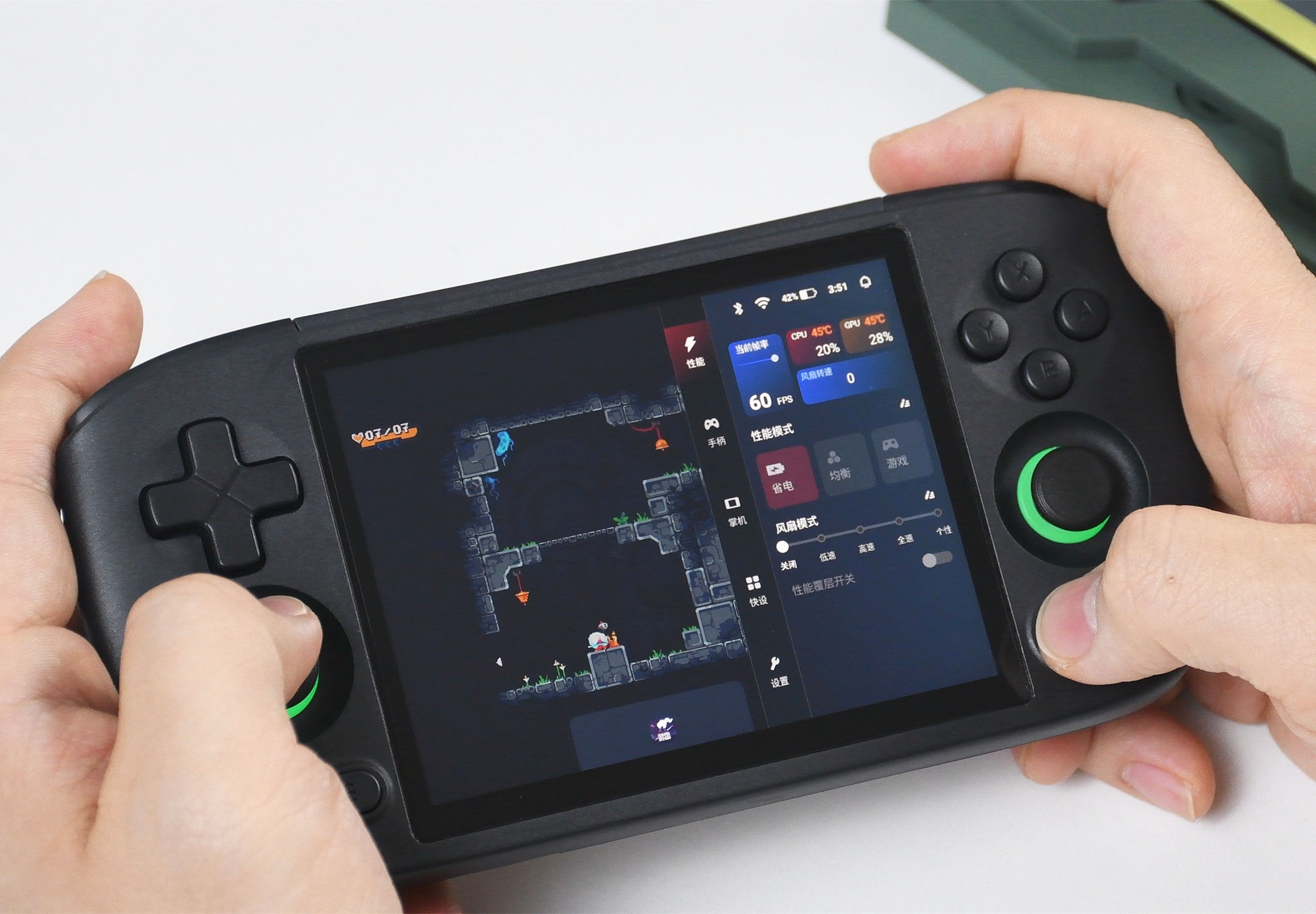 这台安卓游戏掌机的A/B/X/Y键以及十字按键均为导电胶材质,手感还行,回弹比较快。摇杆为下沉式设计的霍尔中摇杆,但由于整机尺寸比较小,正面的按键跟摇杆之间的距离比较近,所以操作按键时,指腹部分位置会被摇杆碰到。