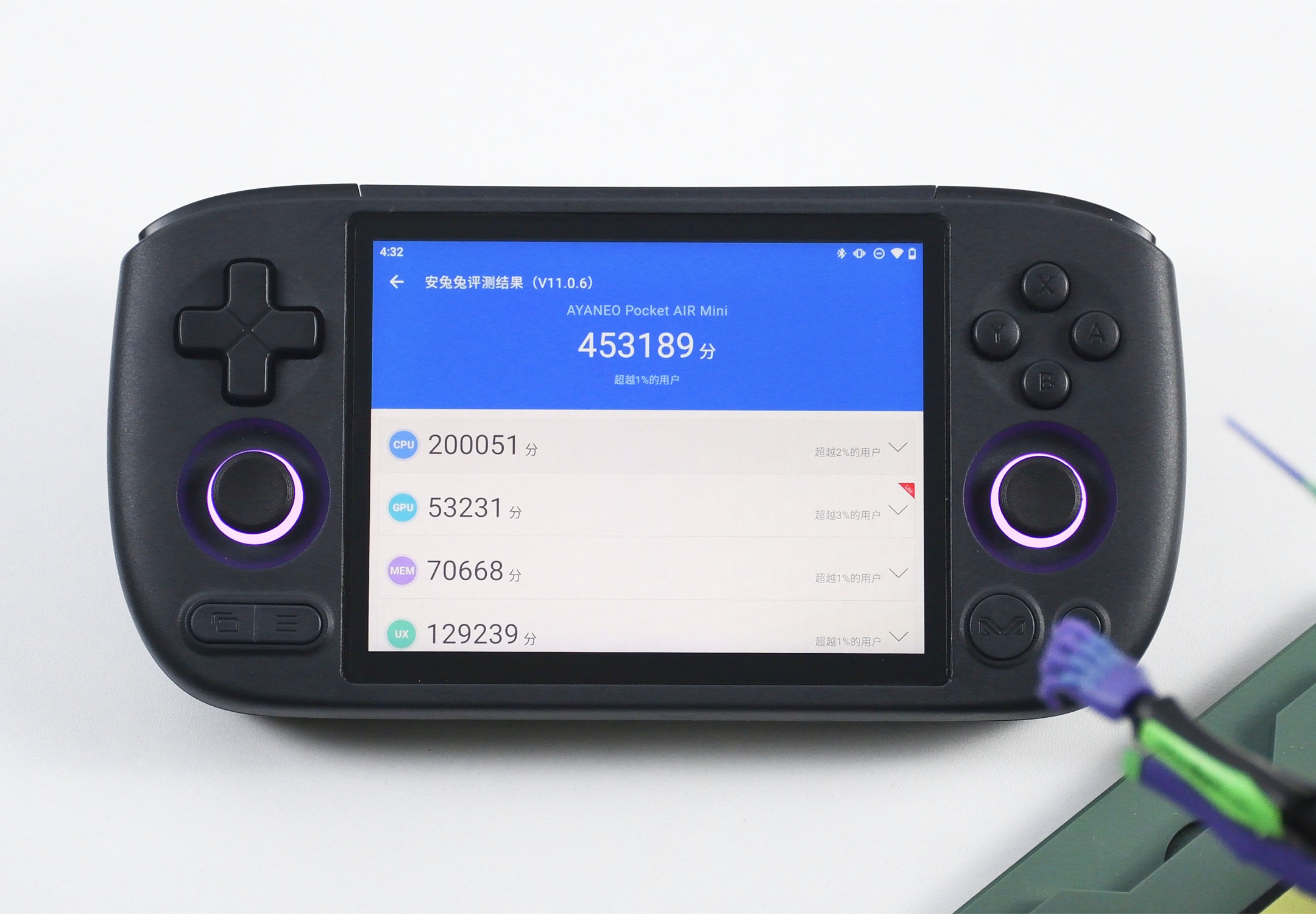 另外,AYANEO Pocket AIR Mini的性能也还可以,搭载了联发科G90T处理器,4500mAh容量的电池,我用“安兔兔”测了下硬件性能,成绩在45万左右分,这性能模拟运行像FC、GBA等主机、掌机游戏问题不大,也能“摸到”部分PS2游戏,而系统则为安卓11。