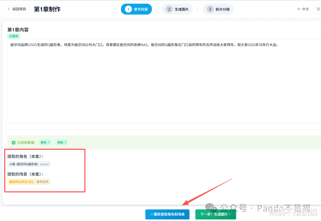 点击之后我们需要描述这个章节的内容,描述好内容之后点击提取角色和场景,项目会自动提取章节中的内容和场景。