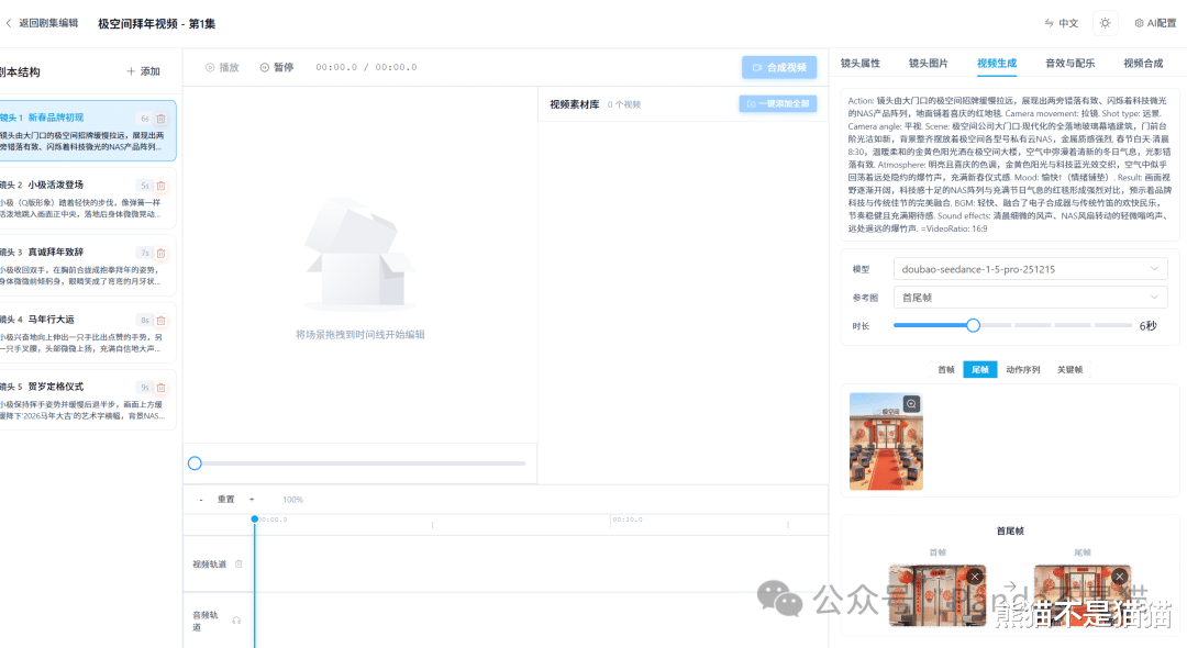 每一个镜头的视频生成之后我们将素材都添加到素材库中,随后再进行视频的合成,这时候就可以得到最终的视频了。(熊猫仅生成了两段作为演示,剩下的大家自行探索)