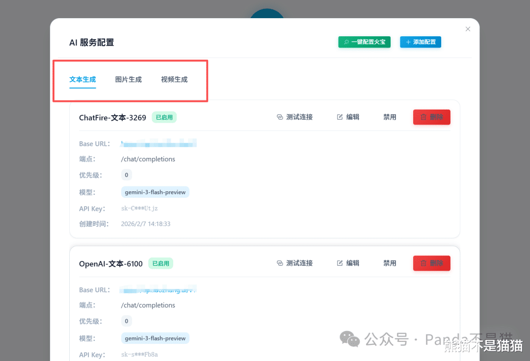 使用体验首先在使用前我们需要配置好对应的模型,而火宝提供了角色生成、剧本创作以及图像和视频多方面的生成,所以模型配置也涉及到了文本、绘图以及视频。