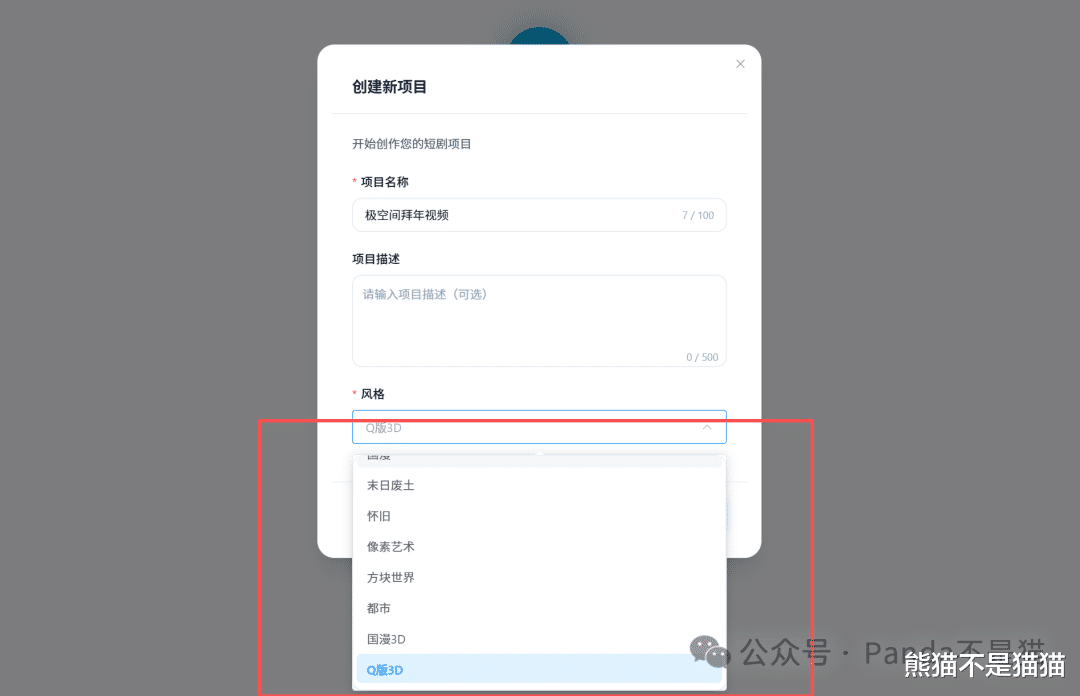 配置好API之后就可以开始创建项目,首先是给项目命名,下方可以选择视频的风格,提供的风格种类还是蛮多的,因为是拜年视频,又因为是虚拟形象,所以这里熊猫就用Q版的3D吧。
