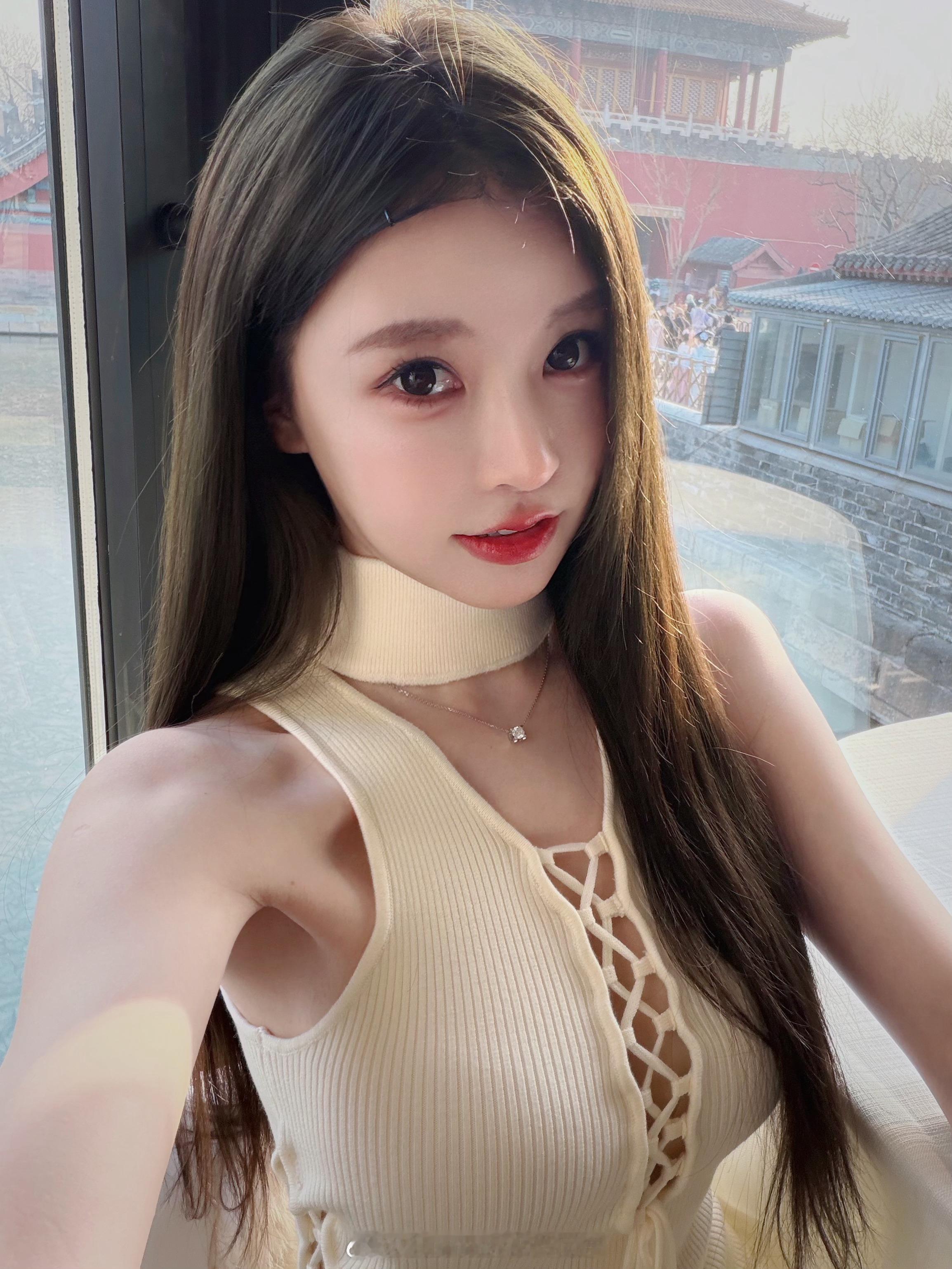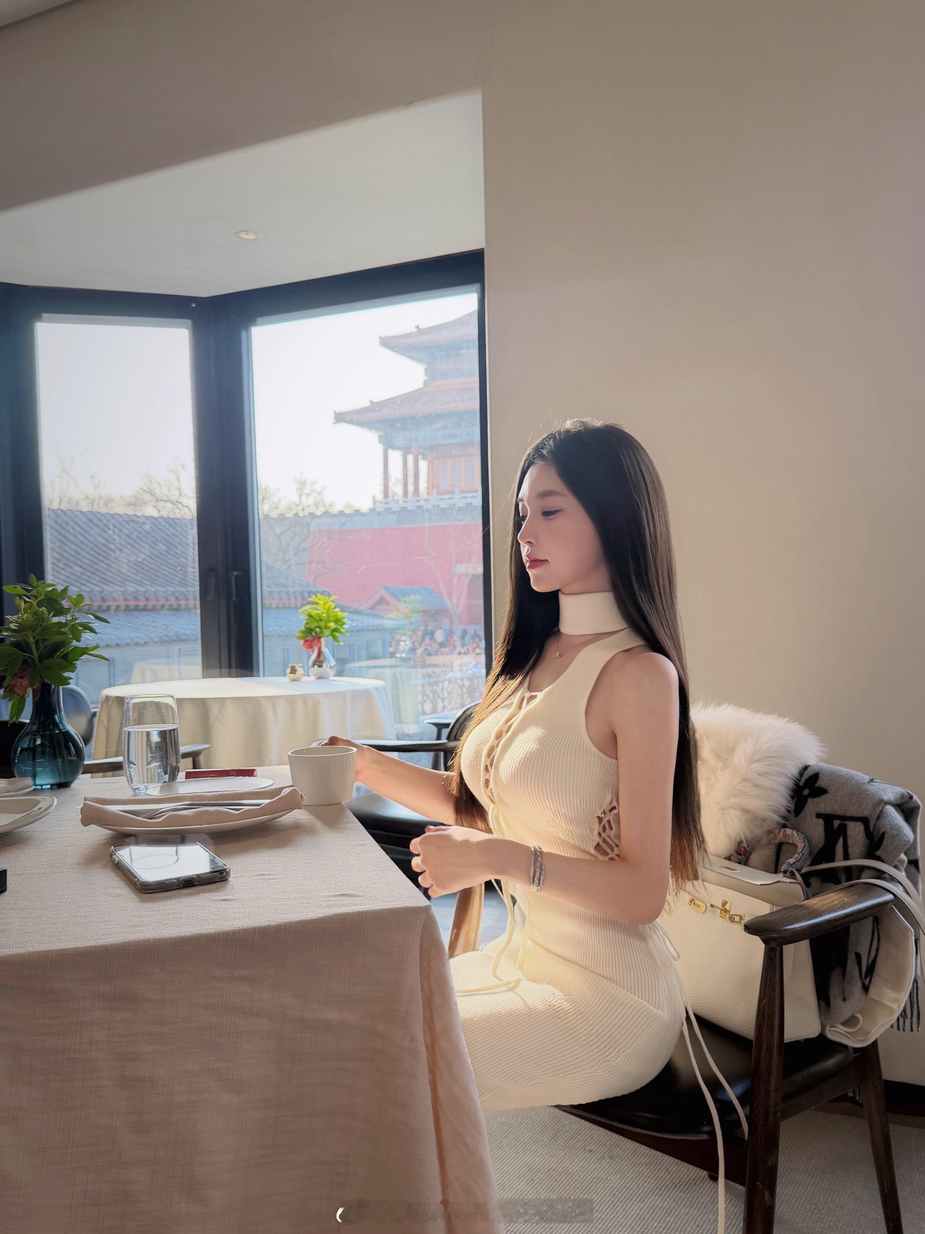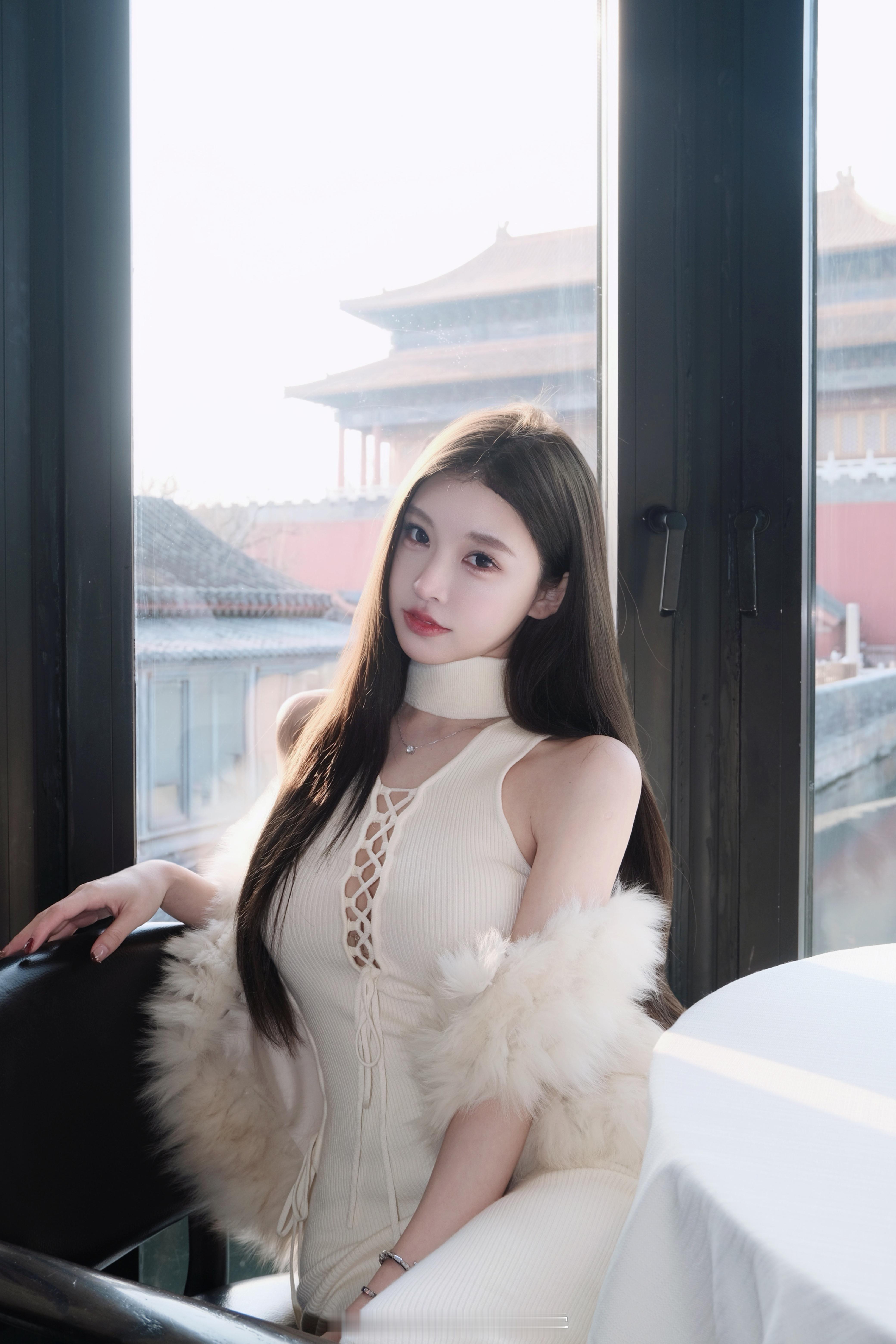 白色无袖修身连衣裙,利落剪裁凸显身材曲线,领口与侧边系带的独特设计增添精致细节。在红墙黄瓦的古建背景下,于现代简约中注入东方古典韵味,整体是融合了典雅与现代感的“新中式极简风”。