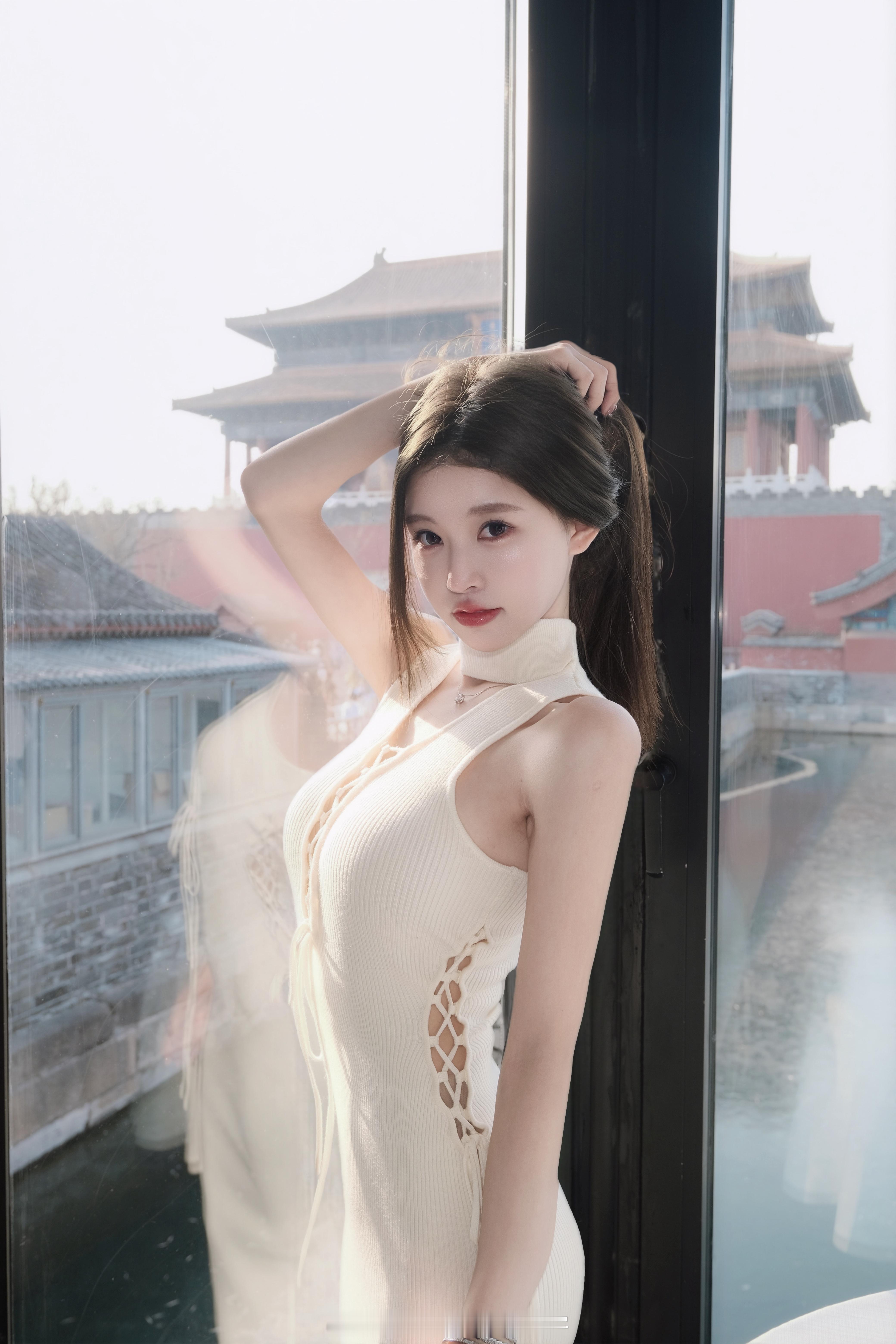 白色无袖修身连衣裙,利落剪裁凸显身材曲线,领口与侧边系带的独特设计增添精致细节。在红墙黄瓦的古建背景下,于现代简约中注入