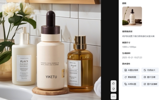 AI商品图:AI商品图支持一键产出拥有丰富场景的产品图片,当您上传一个普通的白底图后,你可以选择不同的场景进行生成图片,AI会在数秒钟之内把该产品放置于对应的情景之中;