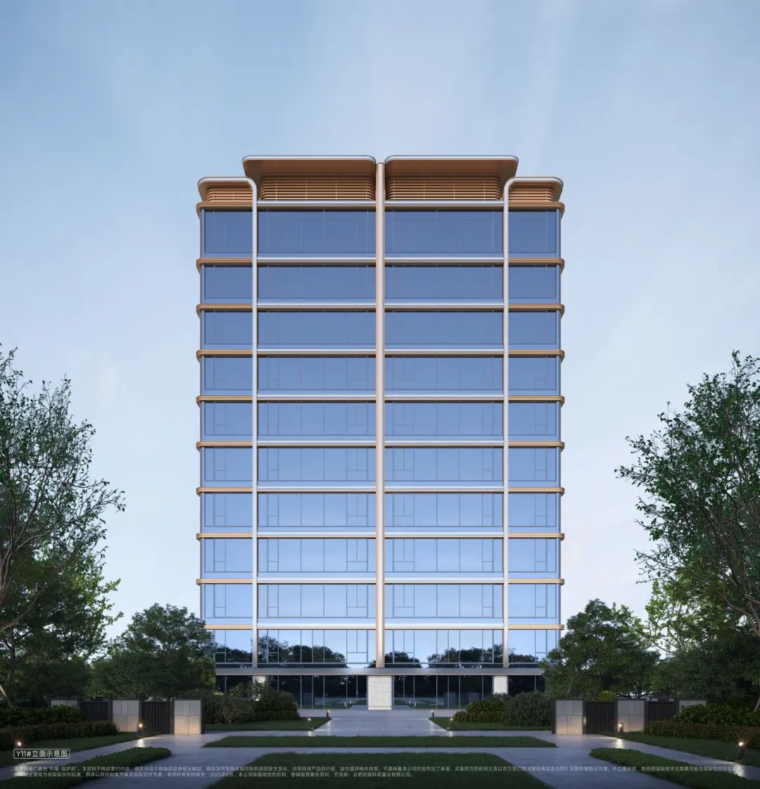 公建化外立面整体由大面积玻璃+双色铝板组成,光影感浑然天成;弧线塑造顶部外檐,增强了屋檐与顶层之间的进退变化,形成极具辨识度的城市天际线。