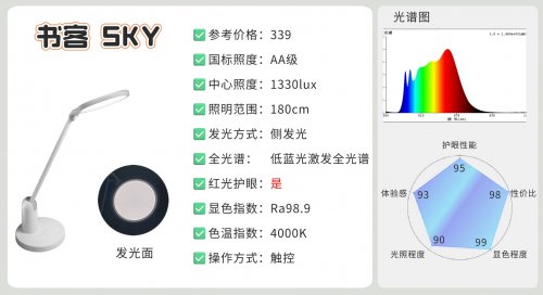 过去很多人都觉得,护眼效果好就得牺牲亮度;亮度高,护眼效果就难稳定。书客sky打破了这个“二选一”困局,以硬件级低蓝光护眼技术从光源芯片层面正面硬刚有害蓝光,精准拦截400-450nm有害高能蓝光,再由RRT2.0红光硬核黑技术有效保护视网膜和眼睛其他重要组织,大大减少有害蓝光的影响,将蓝光含量压低至0.6的同时,还降低了90%的近视风险。同时对多项光学科技的深度融合:搭载了全新最强一代SunSilk™护眼芯片和5域环控光学系统,精准释放有益光波组合;配合定向链式光学导引系统,解决传统台灯光照盲区问题,更内置了DT多维漫射2.0,高度模拟太阳光从天空穿透大气层再经地面反射的自然扩散过程,实现了99.6%高度太阳自然光照度还原效果。