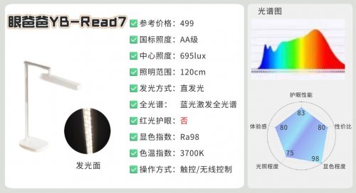 护眼灯最好的品牌排行:第六名是眼爸爸YB-Read7是一款侧重实用功能的护眼台灯,在照明基础配置方面,它采用36cm大直径光源面搭配直发光方式,中心照度695lux,照明范围可达130cm,日常读写的光线覆盖基本够用。