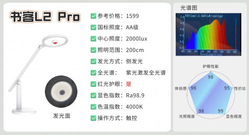 在光线光面,设计了防眩辅助光源,通过双光源配合有效减少明暗对比,降低长时间用眼时的视觉疲劳感;不过显色指数为Ra90,在色彩还原精准度上稍显不足,而且有害蓝光峰值也在1.0附近,整体的护眼效果在同价位中稍显一般。