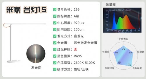 光效上显色指数Ra95,色彩还原度较高,色温范围为2600K-5100K,可满足大部分使用场景。它同时支持旋钮和互联操作,方便进行无极调光,满足不同场景需求。不过,米家台灯1S增强版的UGR防眩指数在19以上,它的眩光比较明显,会影响使用舒适度。