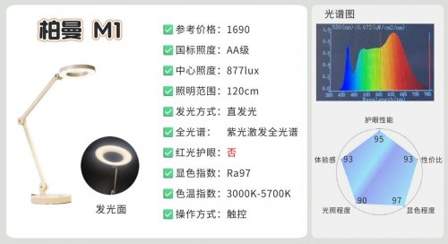 护眼灯最好的品牌排行:第三名是柏曼M1是光源面直径18cm,采用直发光方式使得中心照度877lux,照明范围能覆盖120cm桌面,满足日常学习办公的基础需求。显色指数Ra97,色彩还原度不错,而且它的色温可在3000K-5700K之间调节,还支持无极调光,能根据环境和需求灵活调整光线。