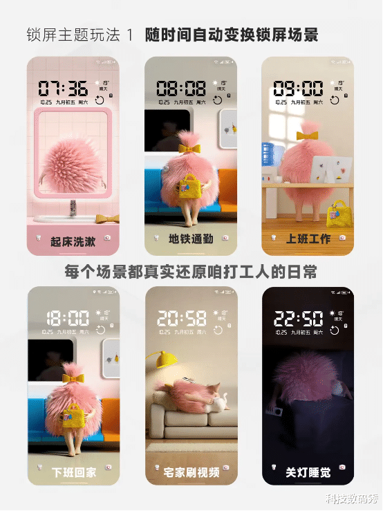 它有多好玩呢?甚至可以根据时间来自动更换场景,从清晨起床洗漱,到匆匆赶地铁,再到埋头上班工作,最后回家刷手机、睡美容觉……它会跟着你一天的行动轨迹自动切换7种场景,这样有趣的主题谁能忍得住不心动?