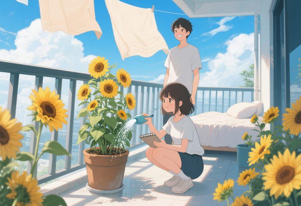 今年夏天,我们在阳台种的向日葵开花了。金黄的花盘跟着太阳转,像极了林晓小时候的眼睛,亮闪闪的,满是活力。我特意买了个大花盆,放在阳台最显眼的地方,林晓每天早上都会给它浇水,还会记录它的生长情况,在笔记本上画向日葵的样子,写 “今天向日葵又长高了一厘米”。