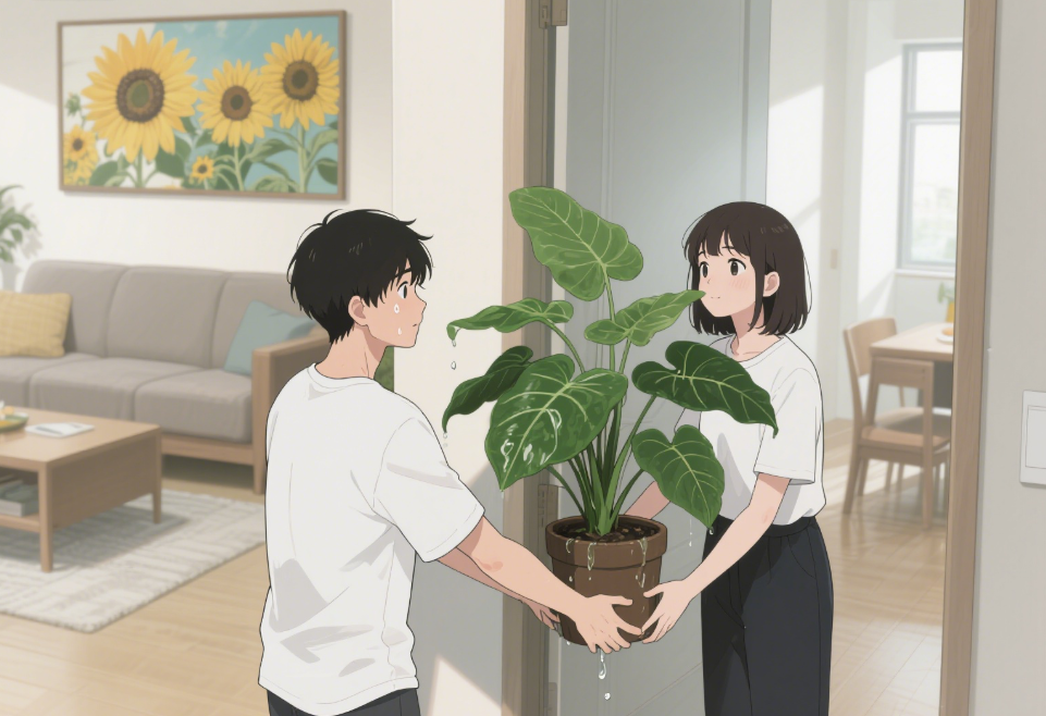 我走到阳台,果然看到了那盆滴水观音 —— 叶片又大又绿,像撑开的小伞,放在阳台角落,旁边还放着一个小铲子,铲头上沾着泥土。林晓上周说要学养花,让我给她买花盆,我还特意挑了个带向日葵图案的,没想到她竟是这个目的。