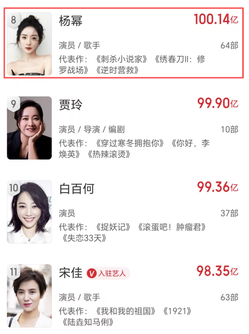 除此之外,女演员票房榜也发生了不小的变动,最让人震惊的当属杨幂。