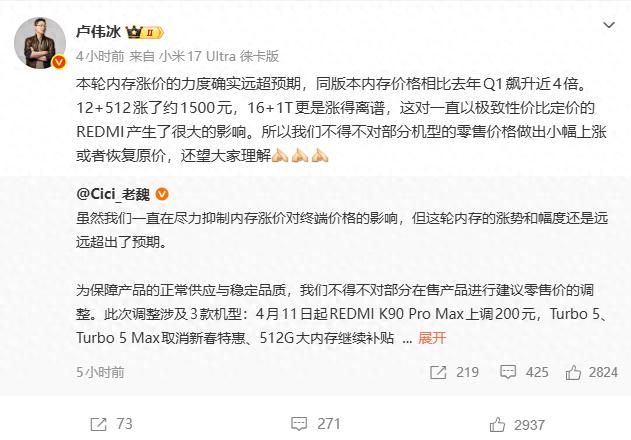 卢伟冰强调,这种成本剧增对一直坚持极致性价比的REDMI品牌造成了巨大冲击。为了保障产品的正常供应与稳定品质,公司经过审慎评估,不得不对部分机型的价格做出小幅上调或恢复原价的决定,并恳请广大用户能够理解。事实上,小米方面早已对此次涨价潮有所预警。卢伟冰曾在今年3月的世界移动通信大会(MWC 2026)上透露,本轮存储芯片的涨价并非短期波动,而是一个预计将持续到2027年底的长周期事件。他指出,这一趋势影响了整个消费电子行业,所有市场参与者都“无一幸免”。