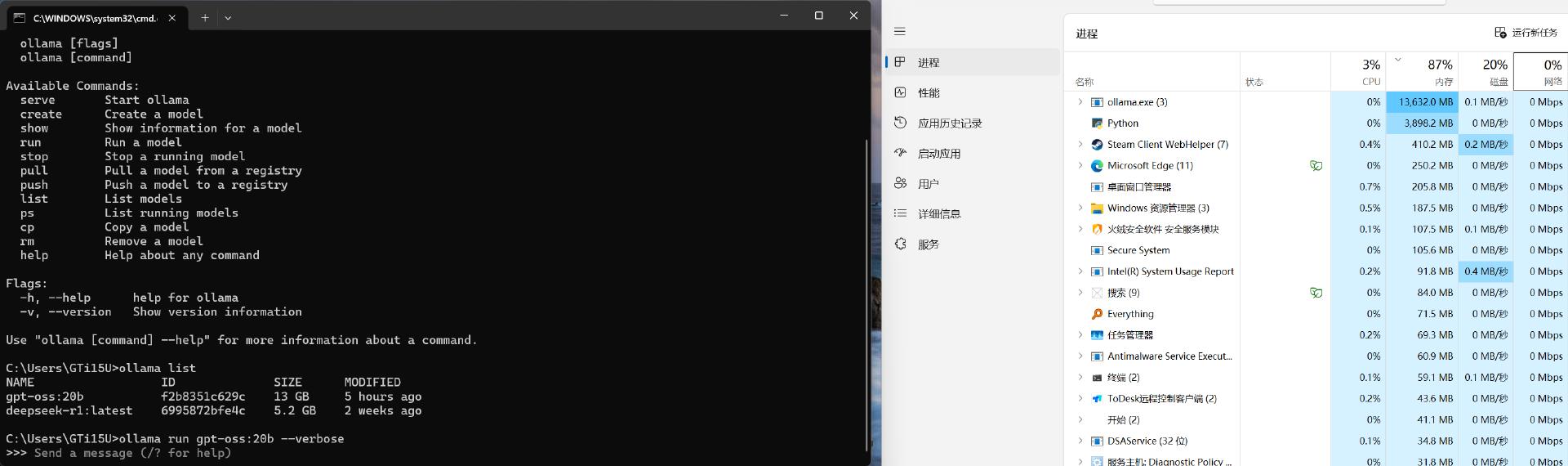 由于 Intel 优化版的 Ollama 暂时还未适配该模型(官方反馈适配中),使用 Ollama 官方(CPU)部署 gpt-oss:20b 进行测试,实测内存占用约13.6GB,对于 32GB 内存的零刻 GTi15 Ultra 来说压力不大。