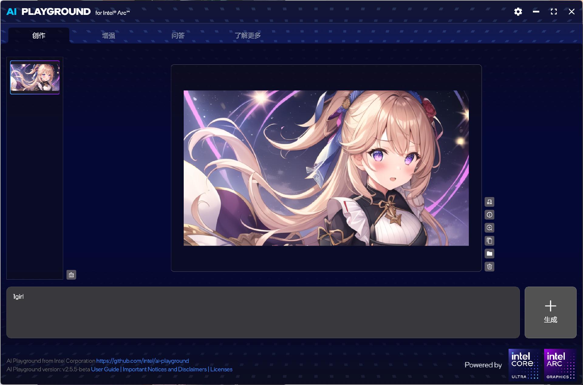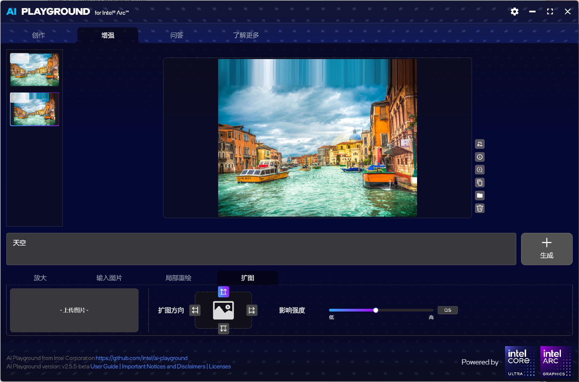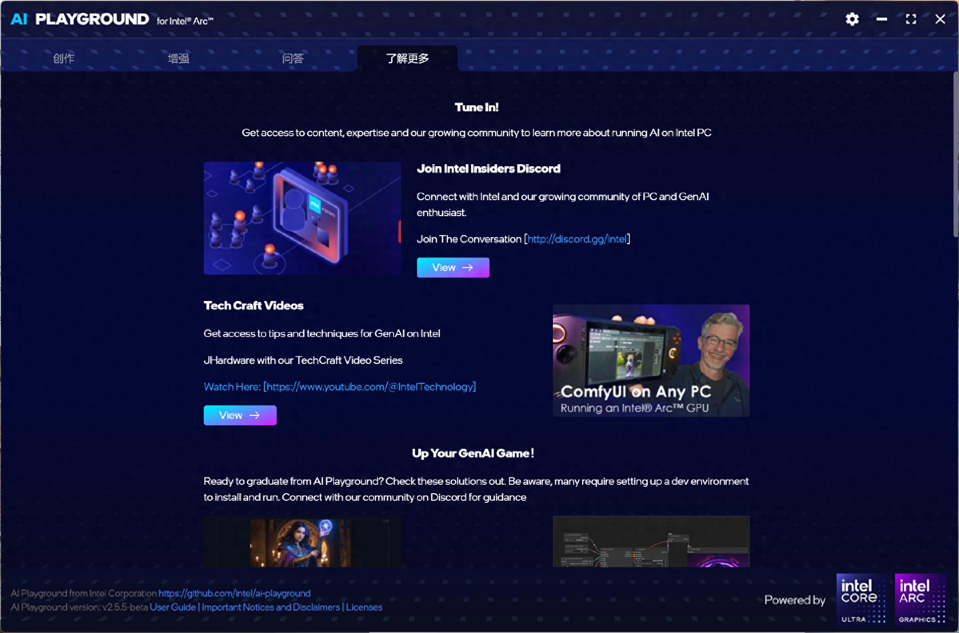 文本生成图像生成语音生成视频生成每一大类都会有很多具体的应用,比如文本生成类就有搜索、代码修改/生成、文本润色/生成、旅游规划、知识库等各种具体的应用。Intel AI Playground是Intel官方针对Ultra处理器和Arc显卡专门适配的工具,目前主要提供了图片生成(文生图)、图片增强(放大、重绘、扩图)、问答等功能。可以一键下载包含运行环境、大模型在内的全部文件,并且可以自动调用算力更高的GPU,实现傻瓜式AI部署。