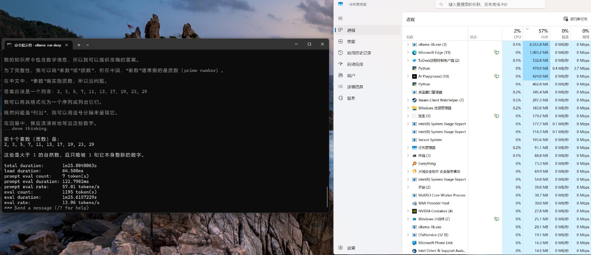 ▼Ollama 运行 Deepseek-R1:8B 占用内存约6.5GB,对于 32GB 的内存压力不大,对生成效果要求较高可以适当提高模型参量(14b 或 32b)