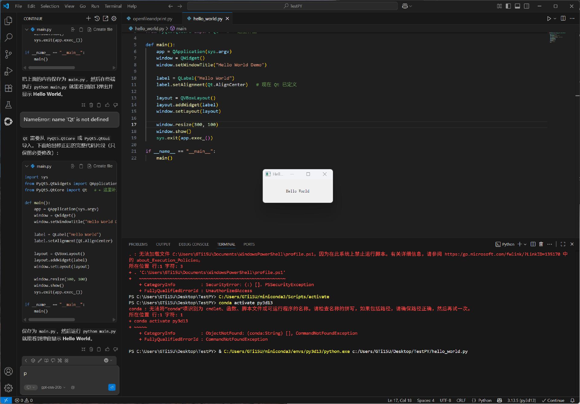 VSCode 安装 Continue 插件Ollama 本地部署大模型Continue 调用本地 Ollama 部署的大模型具体部署教程的内容,由于网络上已经有很多详细文章/视频介绍,这里就不再重复造轮子了。实测使用 ollama 部署 gpt-oss:20b 作为 chat 模型,生成一个 pyqt 的 UI hello world! 程序,大约用时1分30~40秒左右。如果替换成 codeqwen:7B、codellama:7b/13b、codegeex4:9b 等类参量更小的模型,生成速度应该会更快一些。