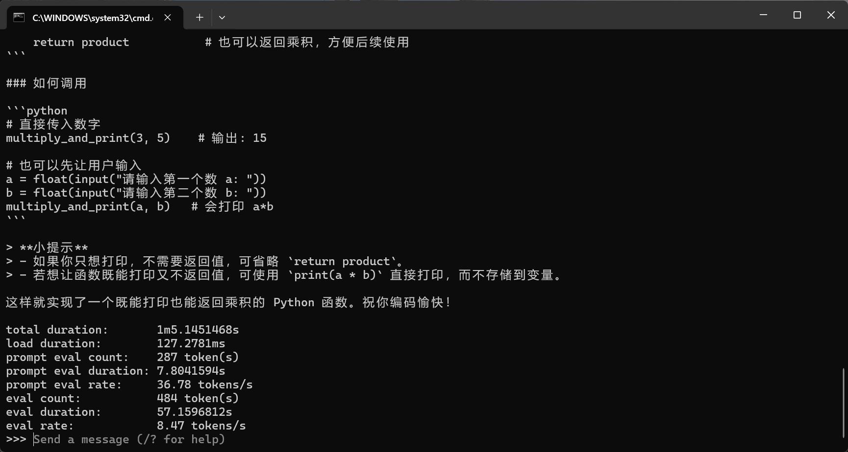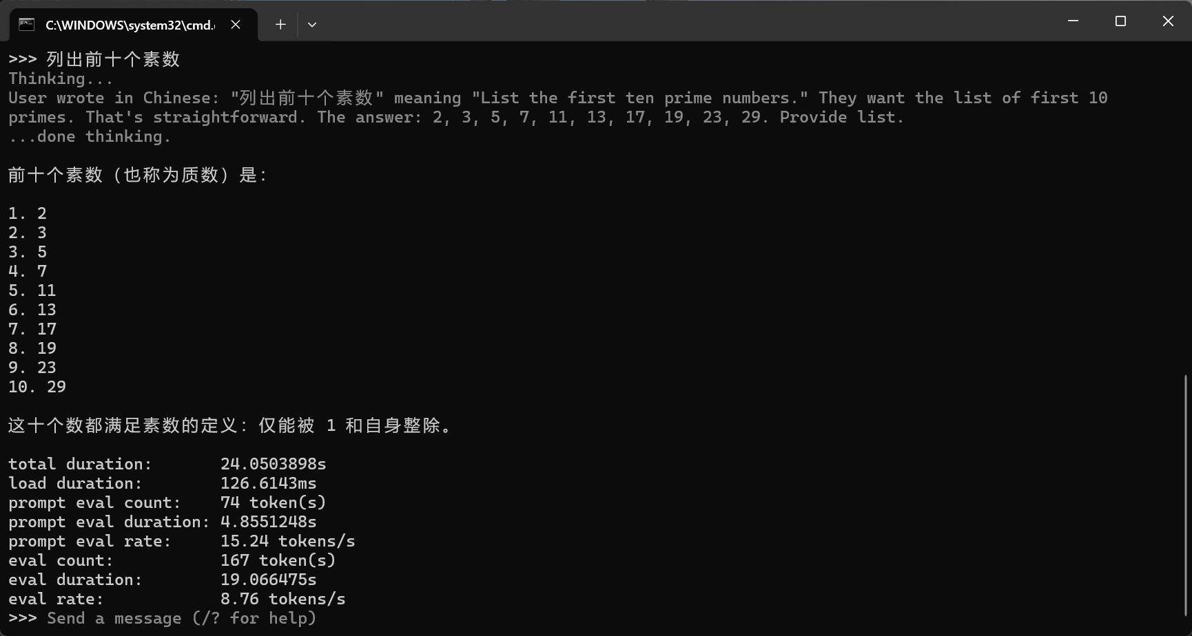 不过gpt-oss:20b的思考深度计算并不像deep-seek那样耗时,实际三个问题分别耗时24、26、65秒,对于本地应用来说速度也是足够快的。