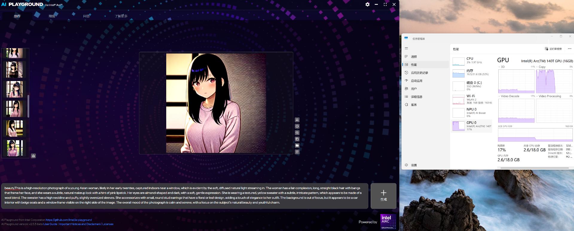 赛博画图速度由于某位Intel大神基于秋葉大佬的绘世整合包,修改的能够调用Arc核显的版本目前只支持Intel Ultra 1XX系列处理器,这次测试CPU和独立显卡部分基于秋葉大佬的绘世整合包,而GPU部分直接使用Intel AI Playground,使用相同的模型测试出图速度。