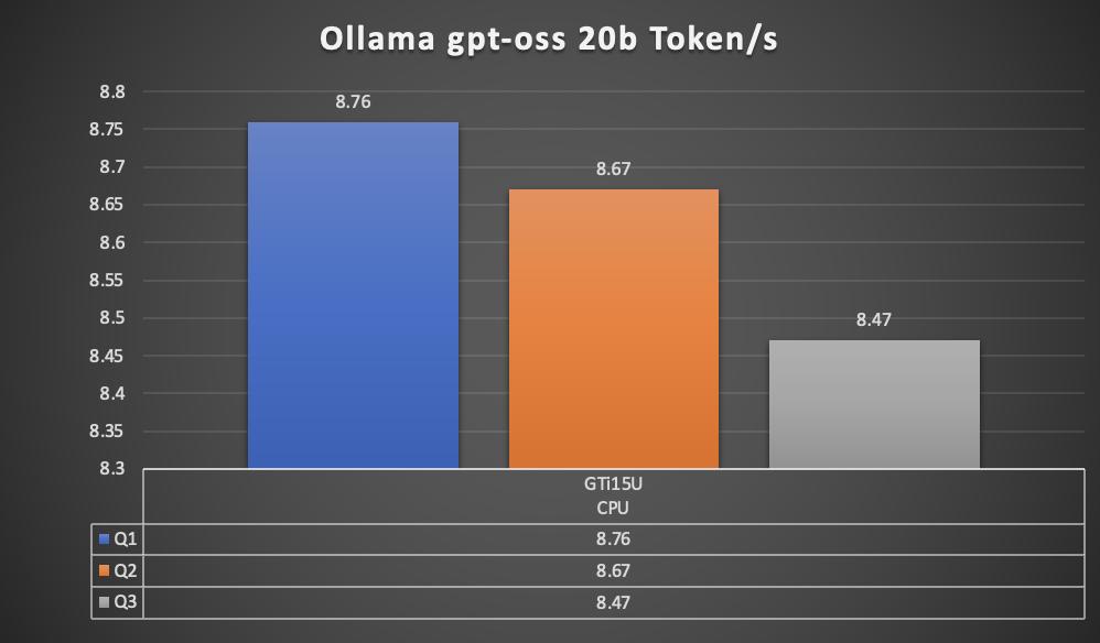 问答模型 Deepseek-R1:8B & gpt-oss:20B问答模型测试中,我们测试了本地大模型生成速度,CPU部分使用官方版Ollama,GPU部分则使用魔塔社区可以下载到的Intel官方提供的优化版Ollama(调用GPU)。使用三个问题测试生成速率(Tokens/s),三个问题分别是数学题、普通问答和编程题目,来测试大模型生成速率。