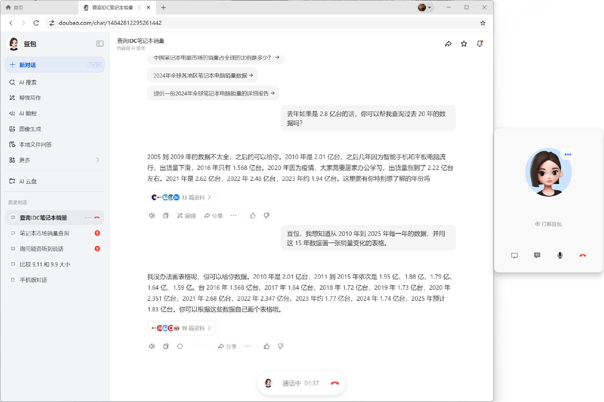 其中较为有趣的是新增的 AI 通话功能,用户可以通过语音通话的方式,逐步让 AI 助手协助完成各项任务。例如,我曾通过多轮对话,让 AI 助手帮忙汇总了笔记本电脑市场的部分销售数据,这种语音交互方式颇为便捷。