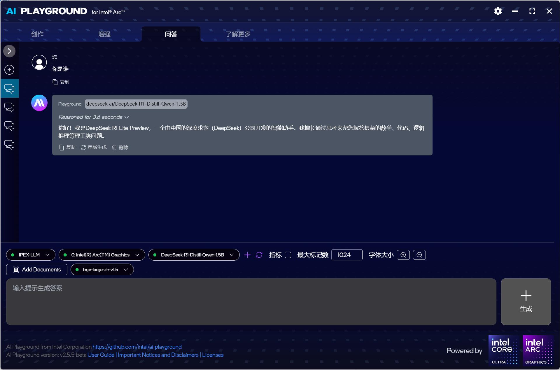 云端部署:优点包括算力更高、单位算力成本更低、部署更简单(很多服务商提供了一键式部署),模型更新速度也很快。缺点在于数据存储在云端、响应速度受限于网络和服务提供商、内容被审核(熟悉赛博画图的用户应该深有体会)、部分模型可能因服务商调整被下架无法提供稳定的长时间服务。本地部署:优点包括数据安全性好、响应速度快、以及自有部署可以提供稳定的服务,内容不受云端审核。缺点在于算力相对较低,单位算力成本相对较高。▼Intel 官方推出的本地 AI 应用 AI PLAYGROUND