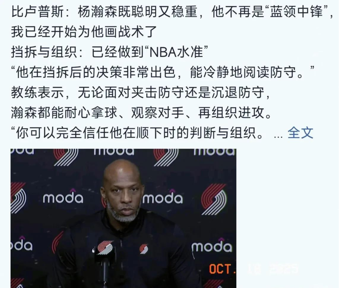 对于杨瀚森最近的表现,球队主教练比卢普斯,给予了高度评价,他表示,杨瀚森既聪明又稳重,球队并没有将小杨看作是蓝领中锋,教练组已经开始为小杨画战术了,而事实上,杨瀚森的确,越来越适应NBA的节奏了,希望这场比赛,再接再厉。