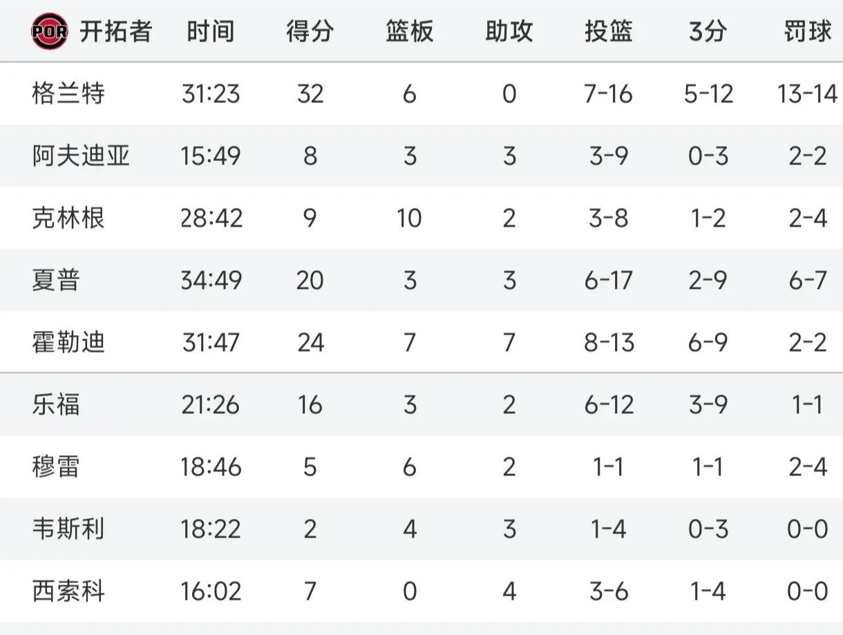 开拓者方面,格兰特拿到全队最高的32分,具体数据如下。