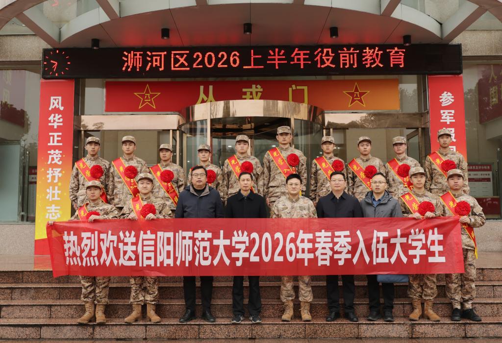 3月16日,信阳师范大学在信阳市民兵训练基地举行2026年春季入伍大学生欢送会。校党委副书记、工会主席岳宗德,浉河区武装部、校学工部、人民武装部和明德书院、崇实书院负责同志及应征入伍学生参加。