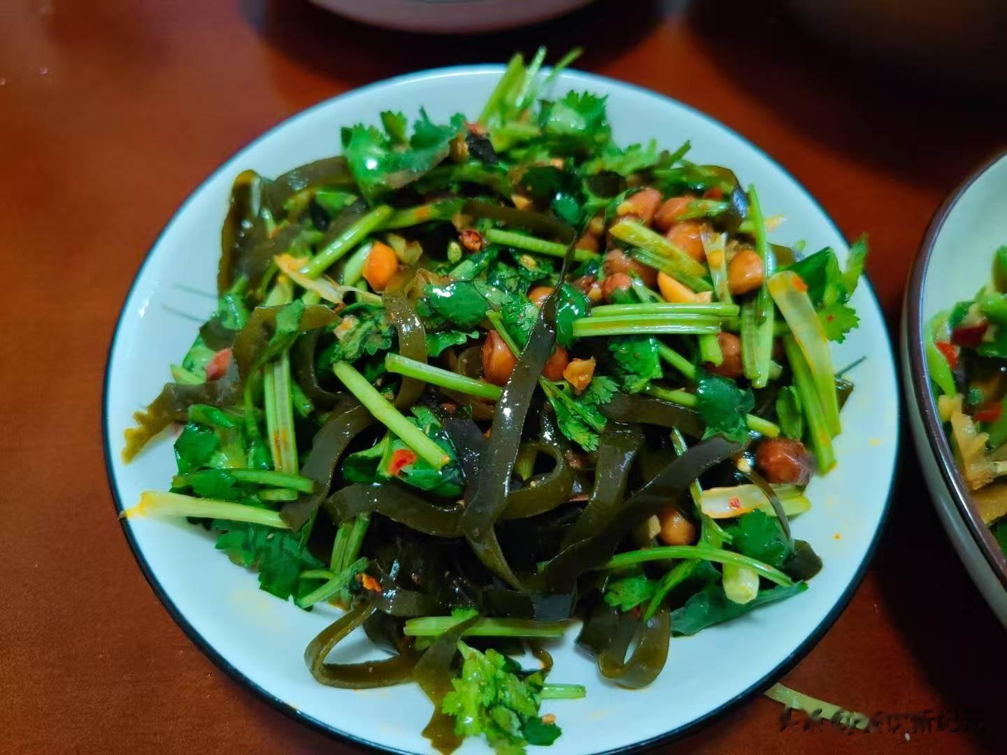 第三个菜是香菜拌海带丝,这道菜也很实惠,只花了2块钱,海带丝是干货,一块钱的海带丝就能够泡发一大堆。