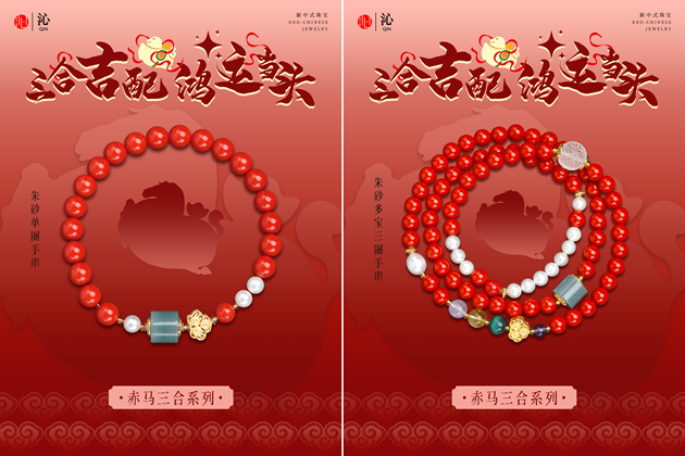 呼应2026赤马年火运昌隆之势,赤马三合系列以“三合吉配、红运当头”为核心主张,选用95%以上高纯度天然朱砂为主珠,醇正丹赤色自带“镇安纳福”古意,为佩戴者注入稳稳流年底气。设计上融入生肖三合智慧,三合银配饰搭配对应五行宝石:火马配浅紫晶、木虎配孔雀石、土狗配黄水晶,五行相生、三合相契,寓意贵人常伴左右。手串巧妙点缀翡翠桶珠、白水晶回纹珠及淡水珍珠,在承载文化寓意的同时更添轻奢精致感,单圈款简约利落,三圈款层次感强,适合通勤、休闲穿搭,全系列覆盖四大生肖组合,满足不同消费者的马年好运需求。