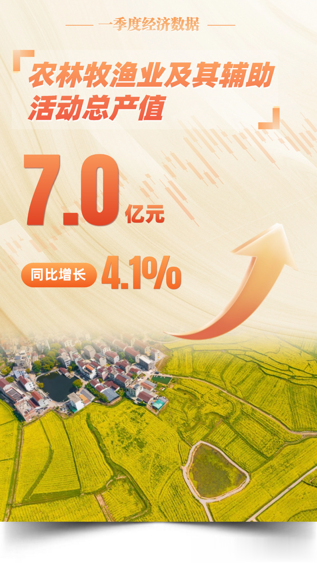 一季度,全市完成农林牧渔业及其辅助活动总产值7.0亿元,同比增长4.1%。其中农业产值3.8亿元,同比增长4.7%;畜牧业产值2.3亿元,同比增长2.1%;渔业产值0.6亿元,同比增长7.5%。3月末,生猪存栏16.26万头,同比增长29.3%。其中,能繁母猪2.14万头,同比增长4.9%。