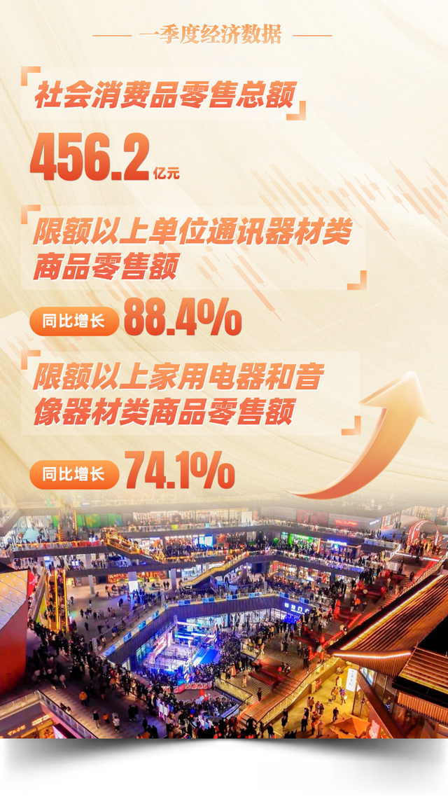 一季度,全市实现社会消费品零售总额456.2亿元。“以旧换新”政策带动相关商品零售快速增长,限额以上单位通讯器材类商品零售额同比增长88.4%,限额以上家用电器和音像器材类商品零售额同比增长74.1%。