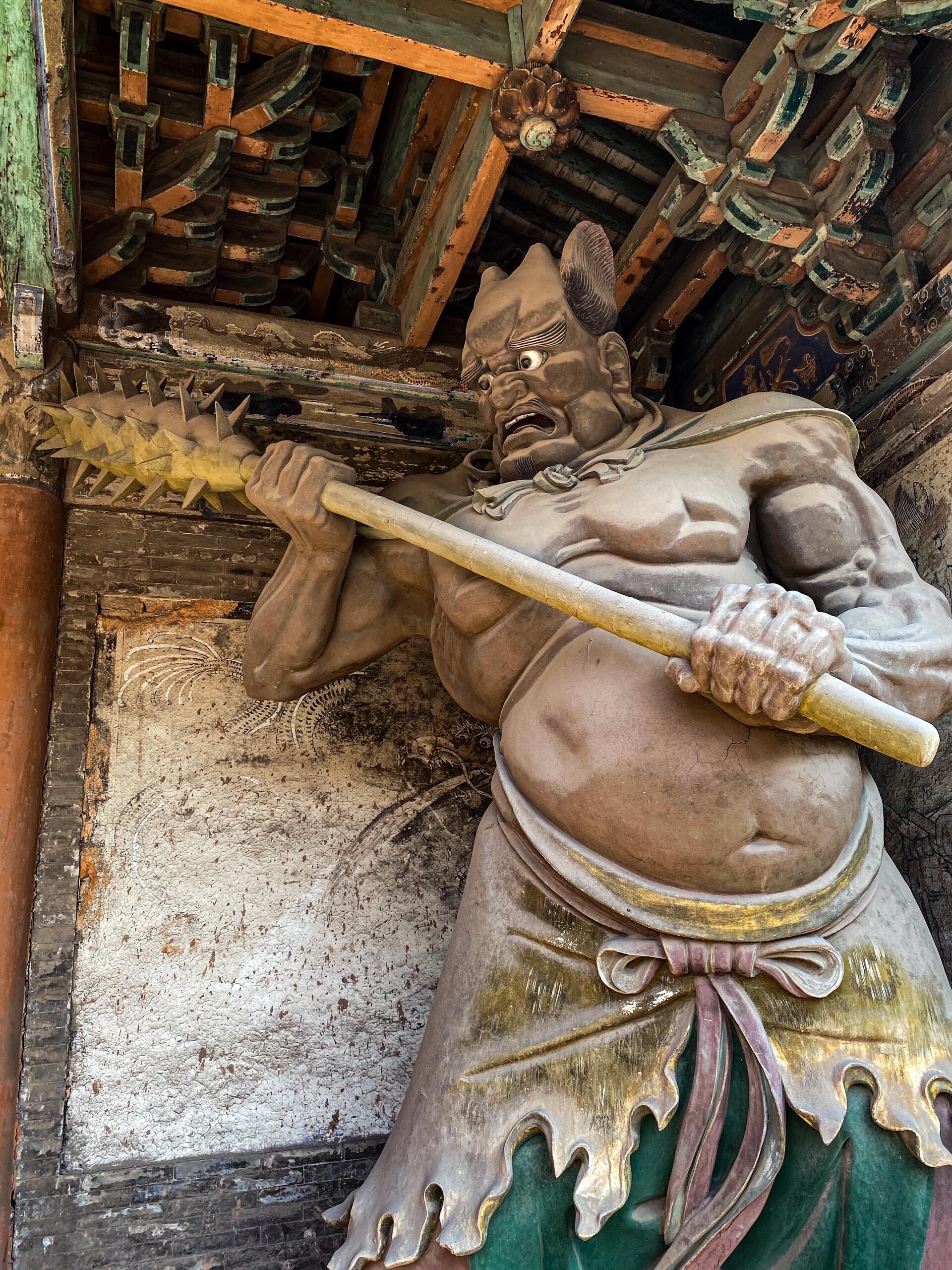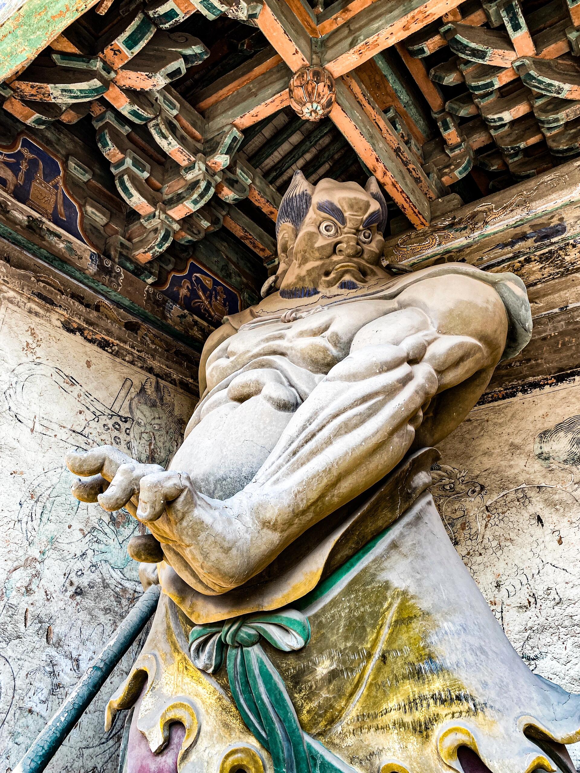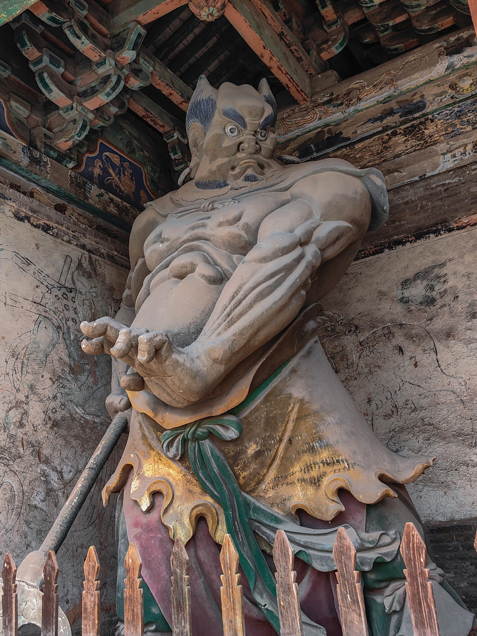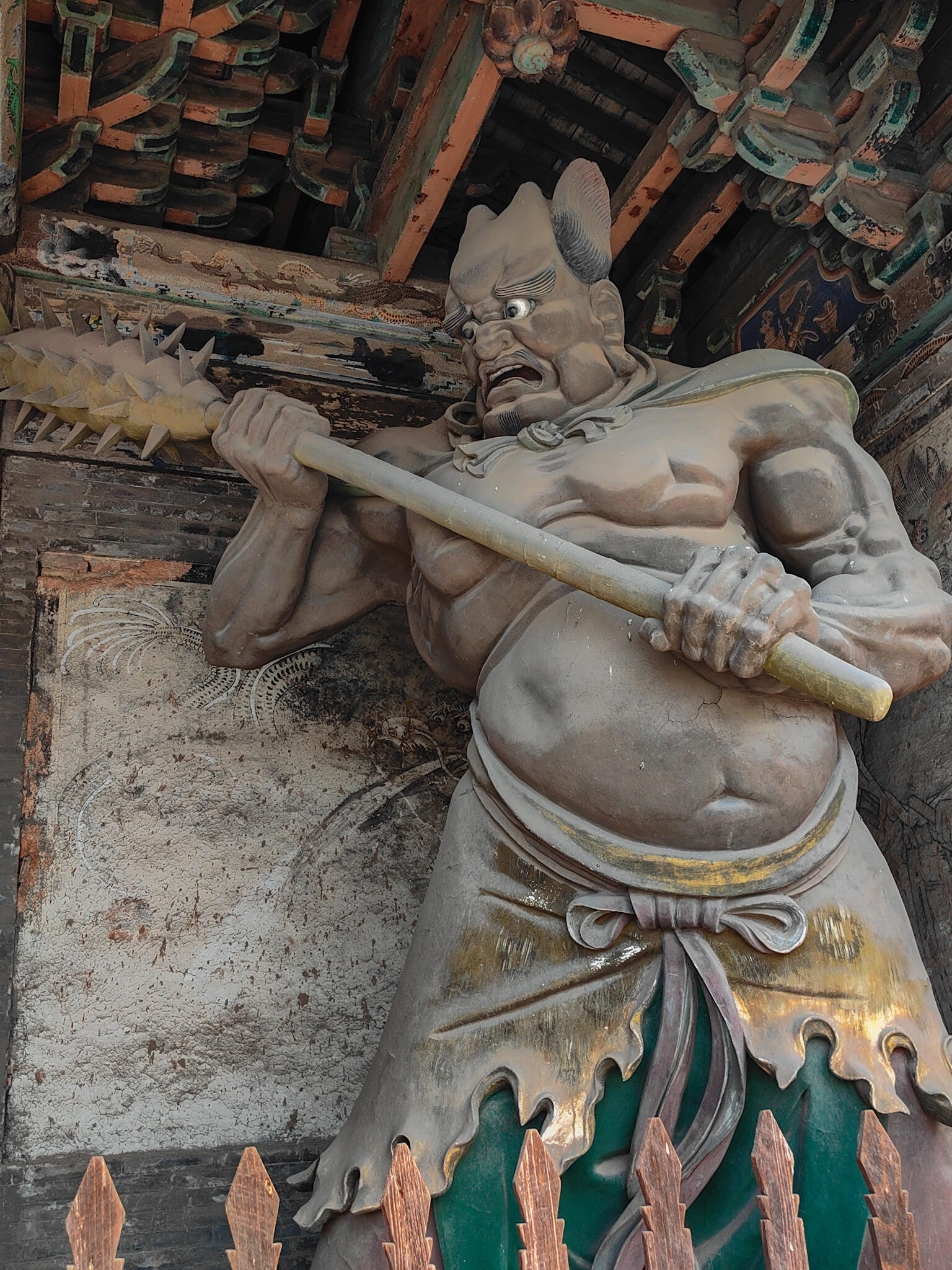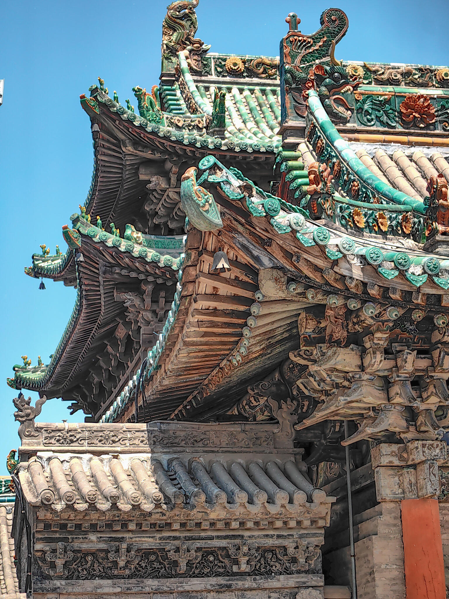 绕过十字街的古槐,城隍庙的飞檐突然撞入眼帘。不同于常见的红墙黄瓦,这里的山门采用罕见的"灰墙黛瓦"规制,屋脊上的琉璃走兽在阳光下泛着孔雀蓝的光泽。建筑学家刘敦桢在《中国古代建筑史》中特别提到榆次城隍庙的"减柱造"工艺——大殿内减去12根金柱,却通过复杂的斗拱结构实现了跨度9.6米的无柱空间,这种宋代建筑技法的活态遗存,在华北地区仅此一例。