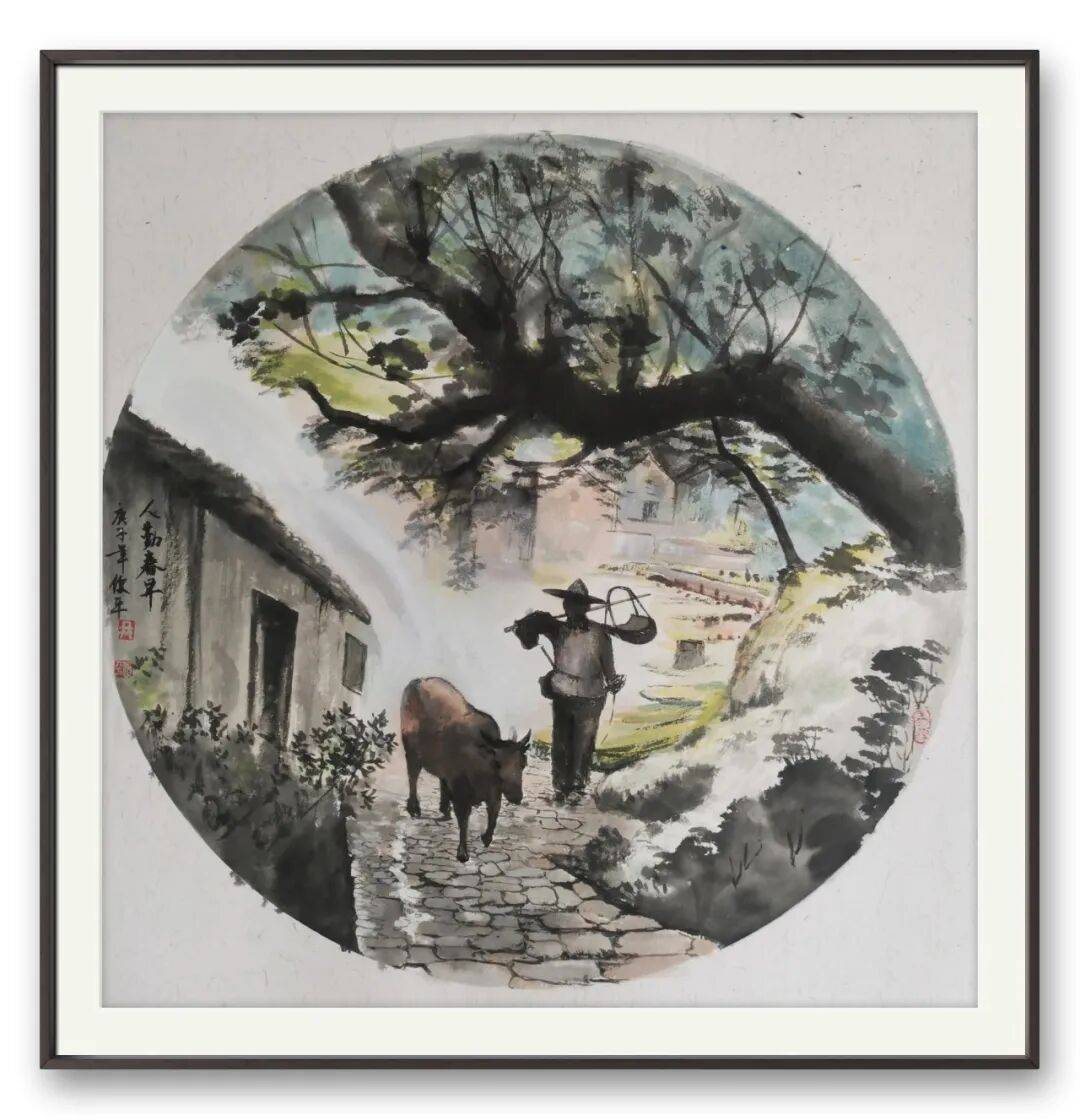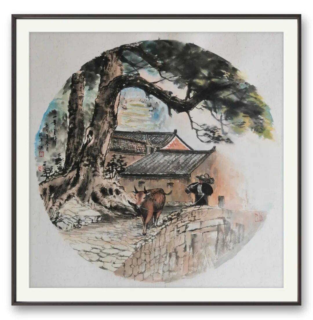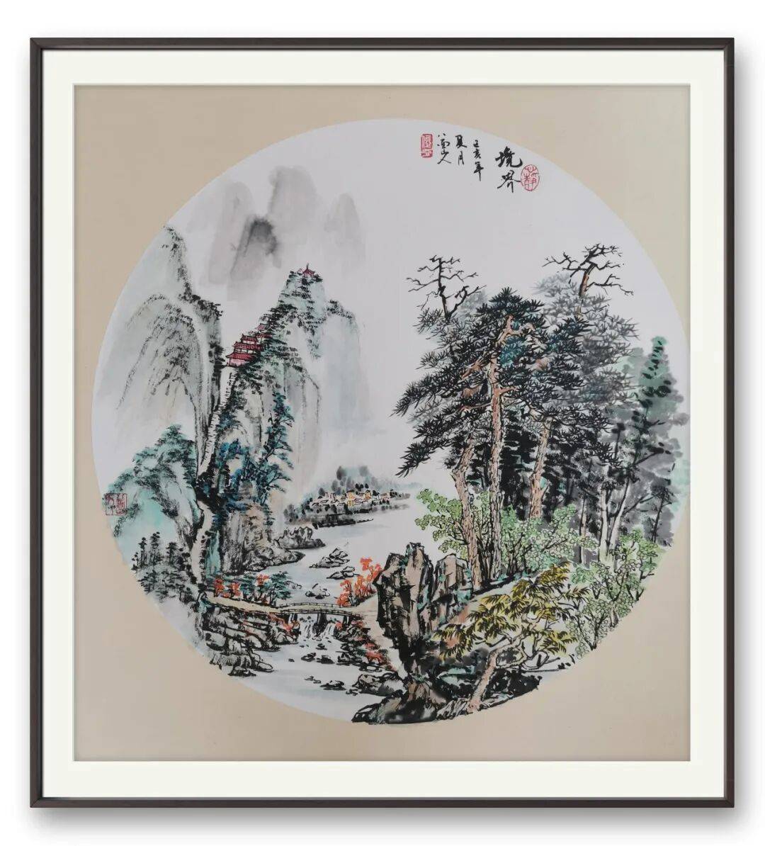 “外师造化,中得心源”,先生的山水深得此髓。无论丈二巨制还是盈尺小品,皆有风骨。古法皴染打底,家乡风物入画,墨色弃绝矫饰,是传统山水的纯粹;水墨氤氲间色调温润,方寸扇面亦有丘壑万千,是简静平和的气韵;笔墨流转处诗意暗生,山川灵韵与心绪相融,是文心与自然的共鸣。三重境界叠进,让山水不止于山水,更成精神栖居地。