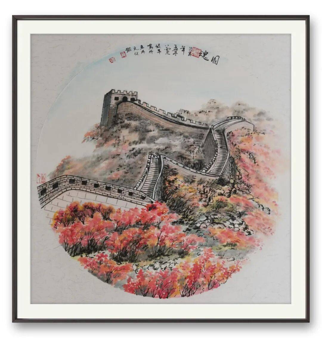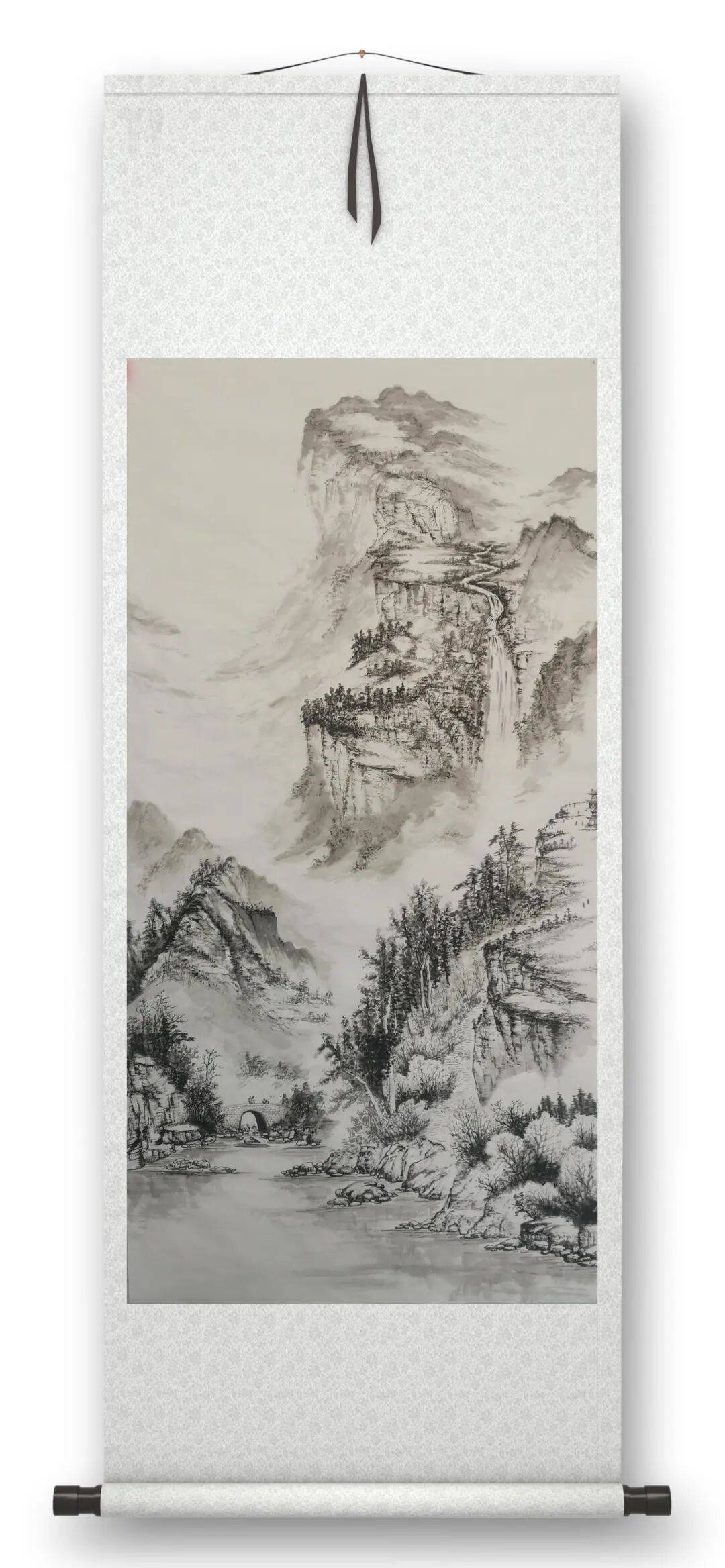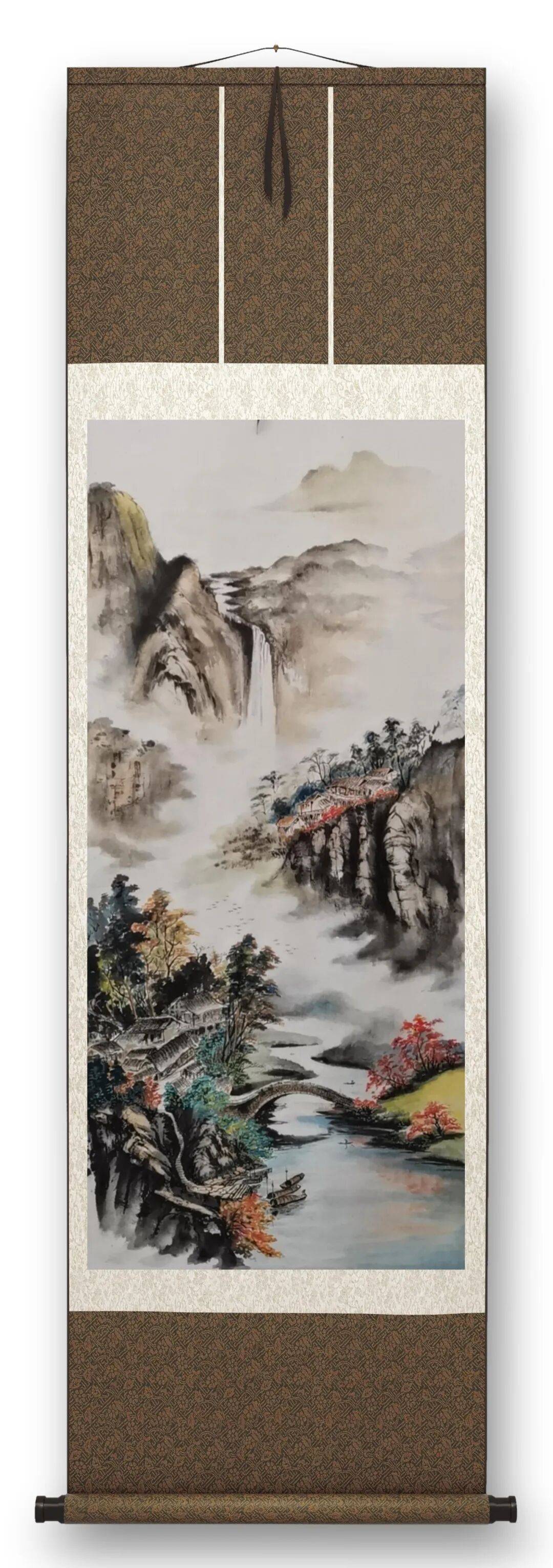 “外师造化,中得心源”,先生的山水深得此髓。无论丈二巨制还是盈尺小品,皆有风骨。古法皴染打底,家乡风物入画,墨色弃绝矫饰,是传统山水的纯粹;水墨氤氲间色调温润,方寸扇面亦有丘壑万千,是简静平和的气韵;笔墨流转处诗意暗生,山川灵韵与心绪相融,是文心与自然的共鸣。三重境界叠进,让山水不止于山水,更成精神栖居地。