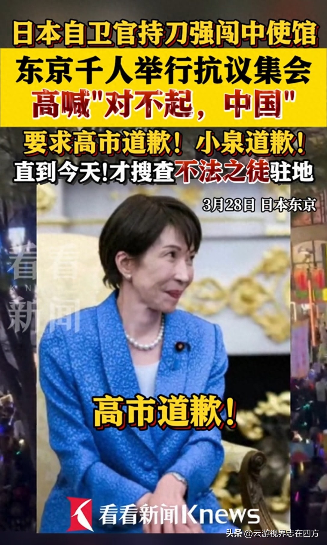 这场闹剧的核心,本应是日本自卫队员少尉携31厘米长刀翻墙闯入中国驻日使馆、潜伏行凶的恶性事件。事发后,日本右翼第一时间妄图洗白官员身份,被事实狠狠打脸后,仅以一句“非常遗憾”敷衍了事,既无彻查决心,更无道歉诚意。而高市早苗内阁借机推动修宪、挣脱和平宪法束缚的野心,才是日本民众恐惧的根源。