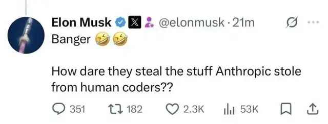 马斯克的反应更直接,他在外网上直言:“他们竟敢‘偷窃’Anthropic从人类程序员那里偷走的东西?”这场指控,绝非技术层面的维权,而更像是商业打压,甚至带有浓厚的政治味。
