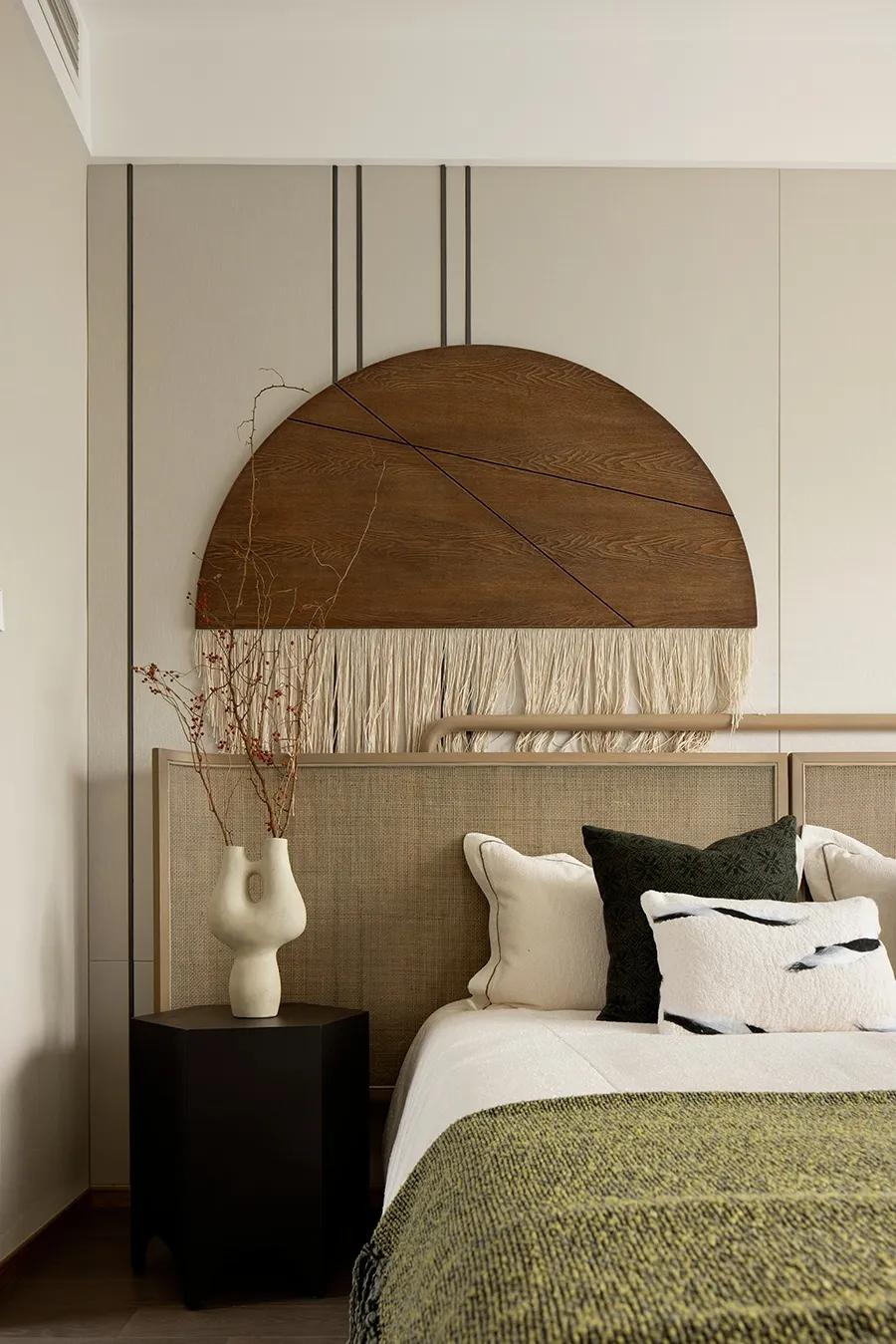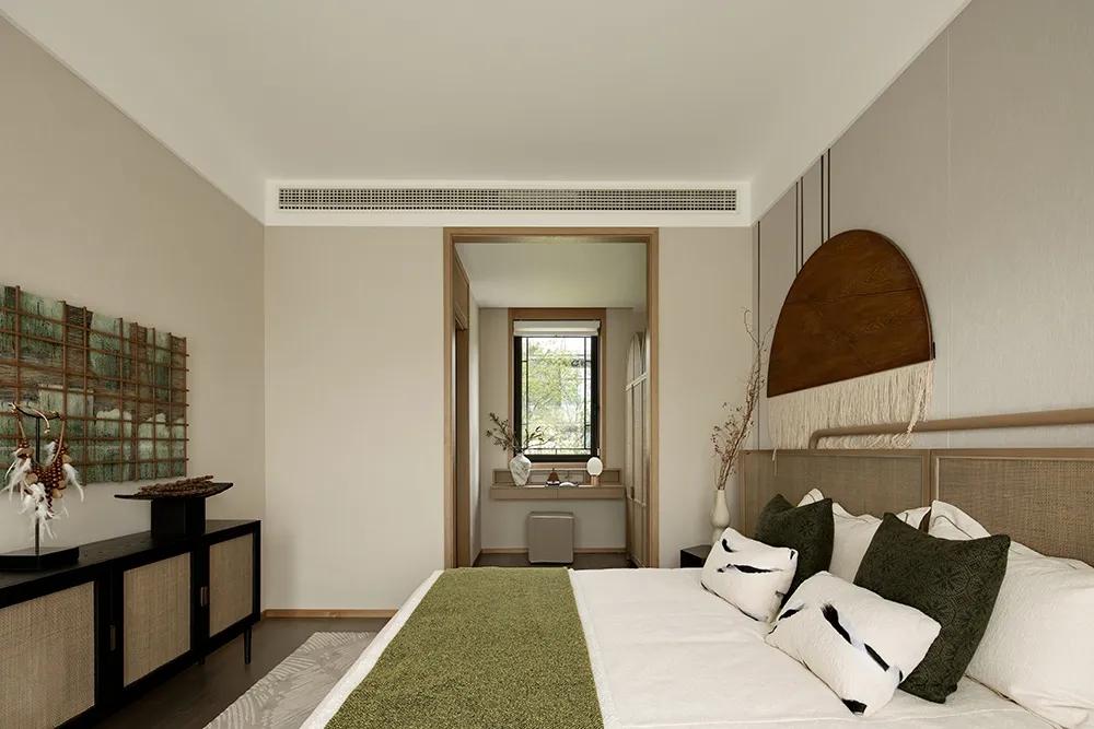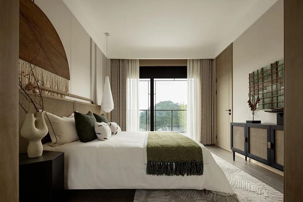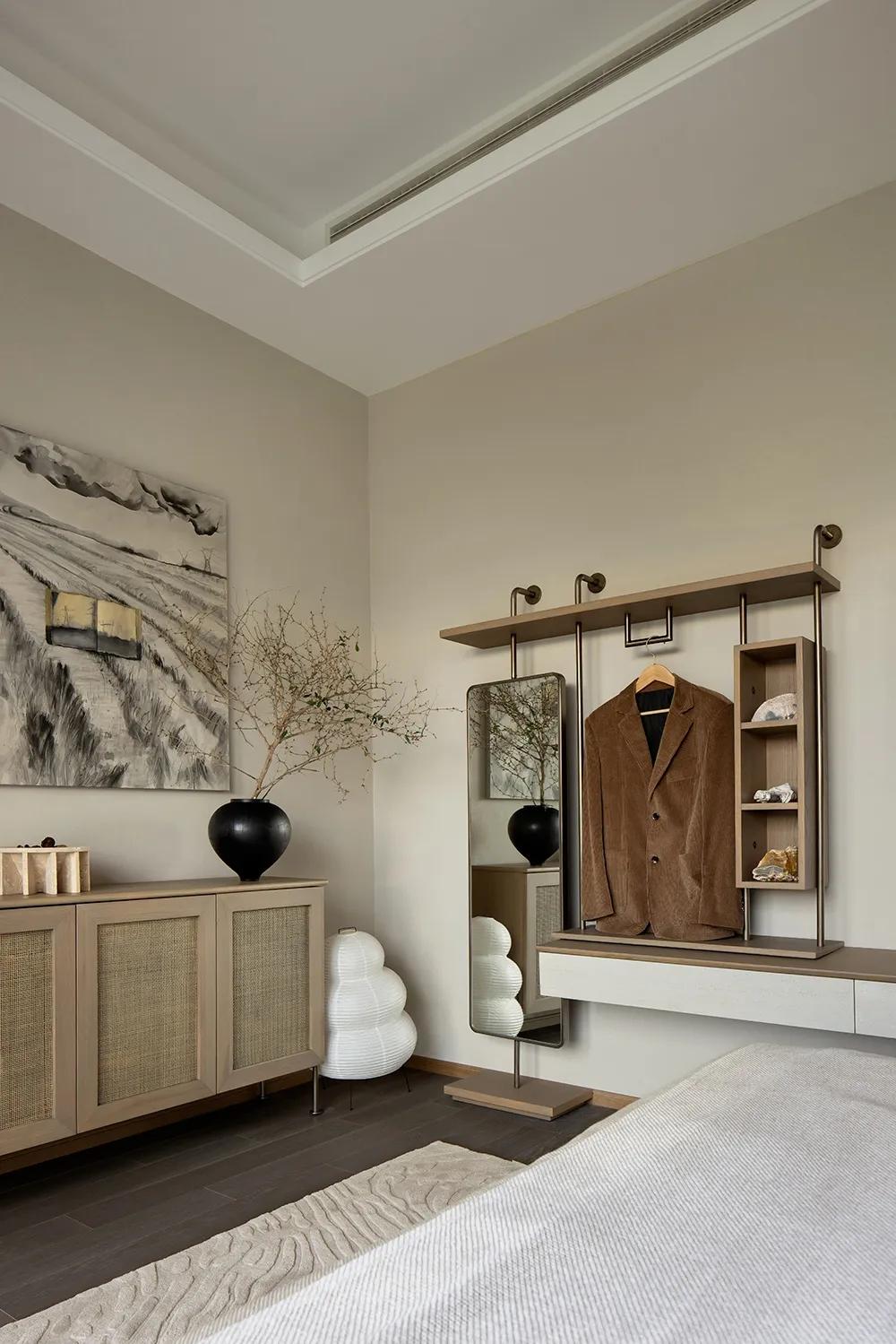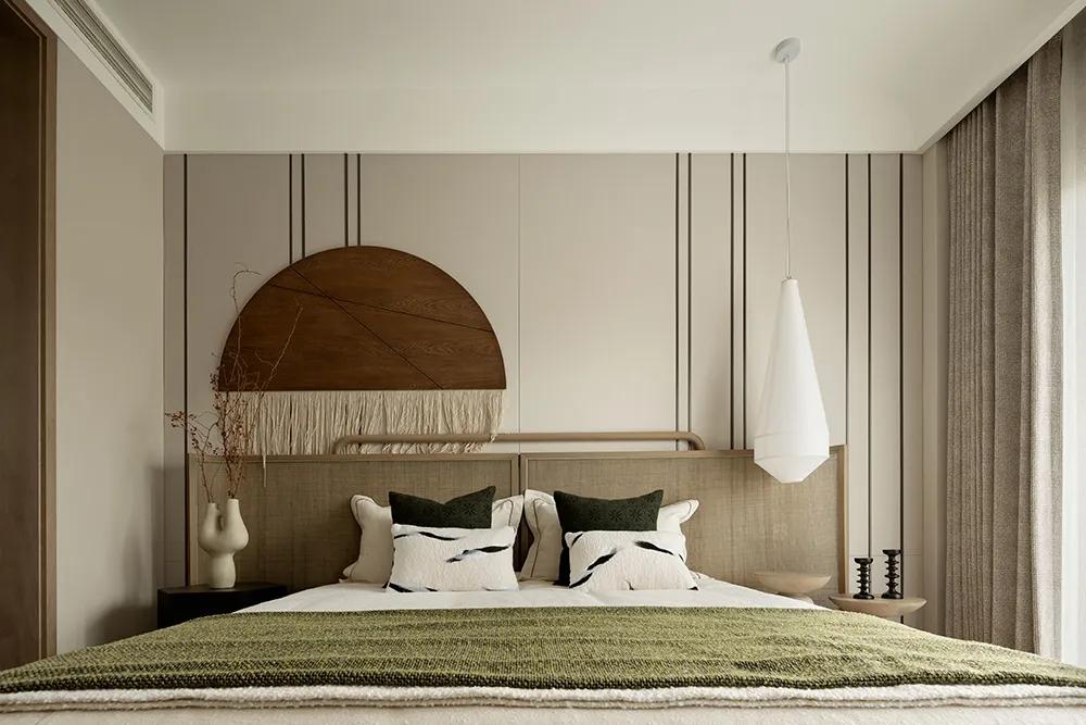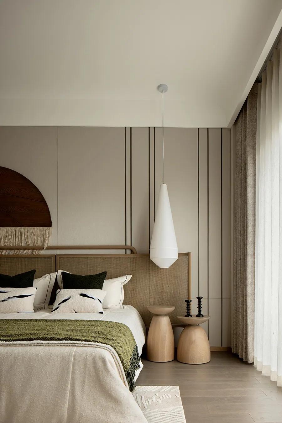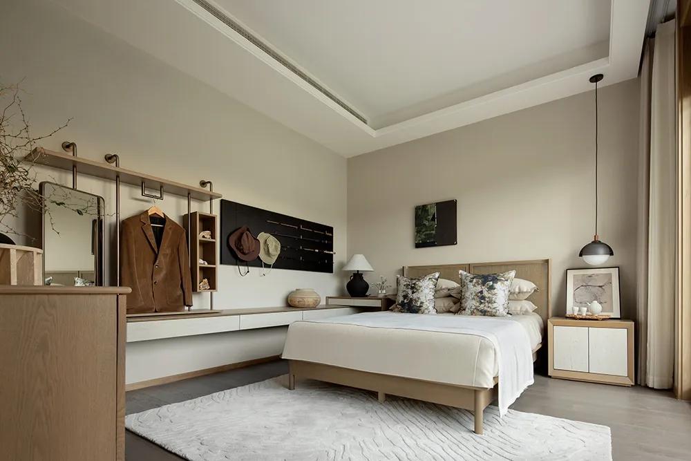 沉浸的时光游走于空间,在平凡中收获生活的真意,正是来自于一颗善于感知美好的禅心。闲适质朴的状态延伸到主卧,空间逐渐深邃,更多了一份岁月静好。将自己放置生活深处,便会感受到更多细节,如窗外湖泊中荡起的涟漪,山间吹来的微风,阳光照耀的光斑,日月星辰的变换……
