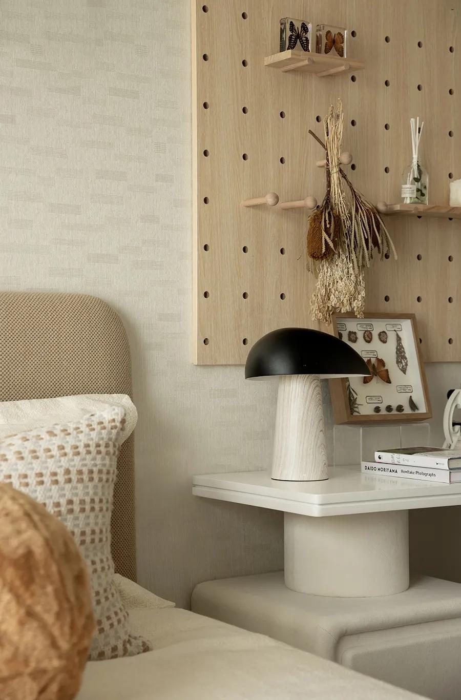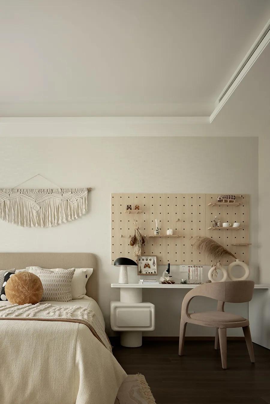 淡淡的橘粉色点缀其中,将女孩内心对于世界的想象点亮。书桌兼具梳妆台功能,孔洞木板装饰墙可任由自己的喜好去发挥。在独属于自我的空间中,写下一些秘密,这里承载着天马行空的梦,等待着它在未来的某一天实现。