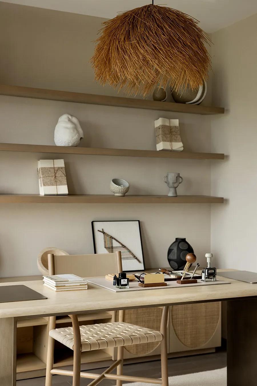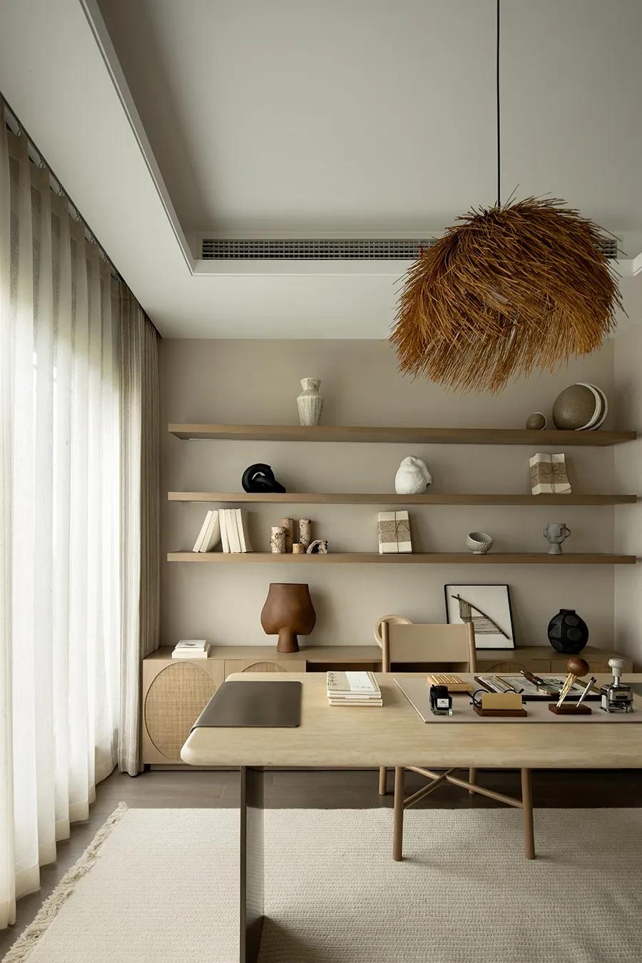 城市久居,更渴望一处田园之居,在这里,日常成为最能取悦自己的途径。书房的营造上,设计师取自然中最常见的木,将空间温暖、朴素的一面展现出来,生命坚韧、包容的底色也随之展露。带着些“野趣”的装饰,更能激起空间的灵动,干草簇拢的吊灯、草编的椅子、麻织的地毯,让城居生活增添了几分了“采菊东篱下、悠然见南山”的本真之趣。