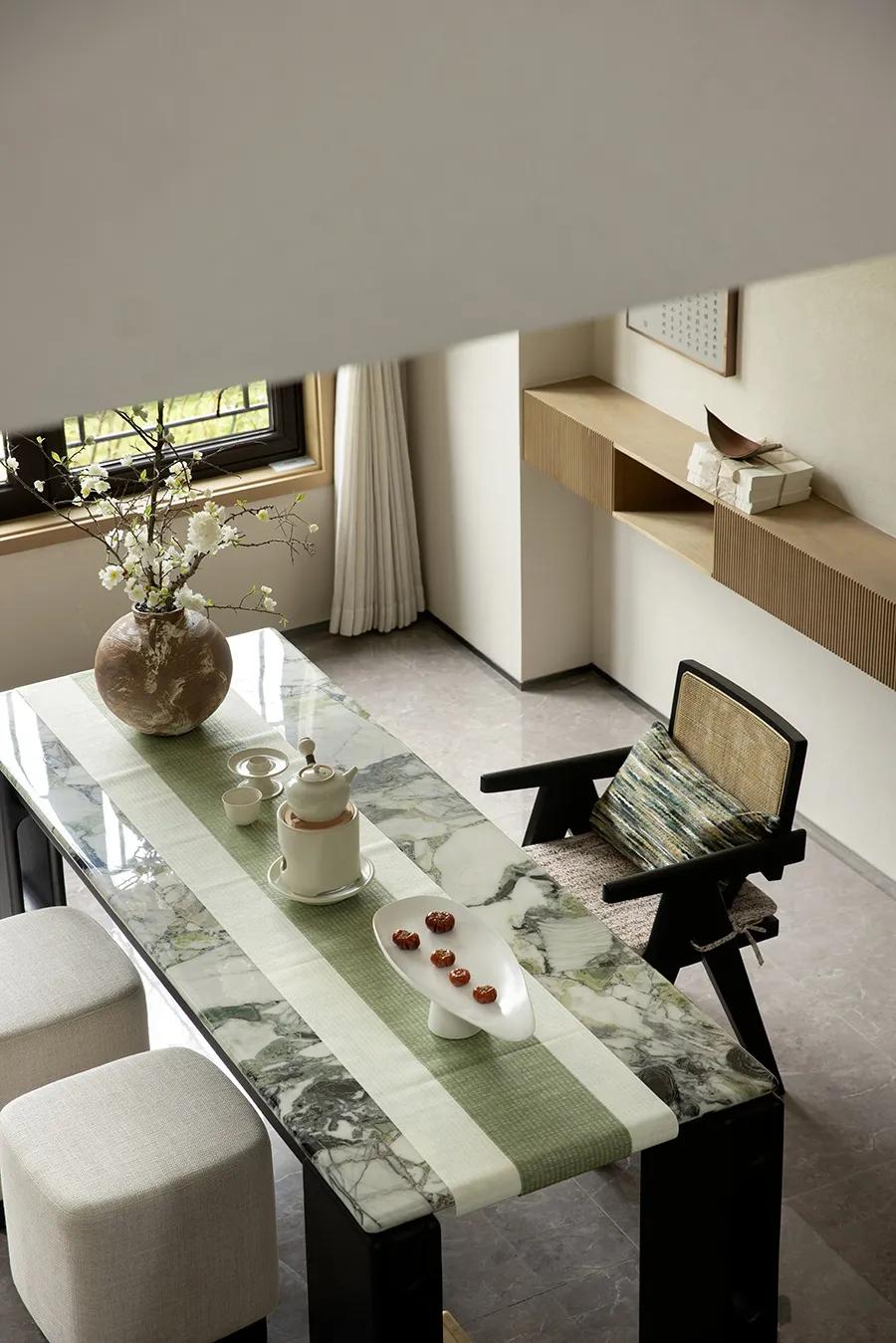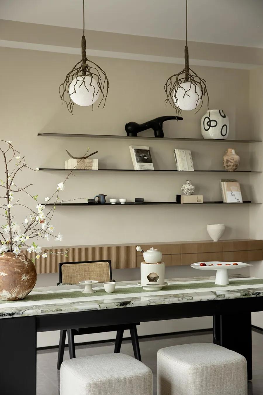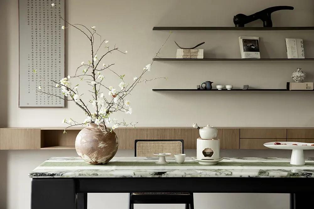 黑与白之中,零星点缀的绿色作为牵引,空间“活”了起来。正因如此,居者在正式的序列与松弛的意境之间找到了平衡。设计师将公共空间打造为一个多功能的社交场所,功能紧凑,但空间并不显局促,以客厅为核心,左右两侧分别是用餐区与品茗区,无不彰显着江南文人的清雅与品位。