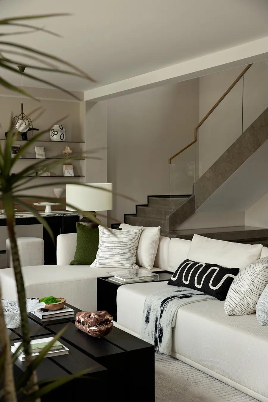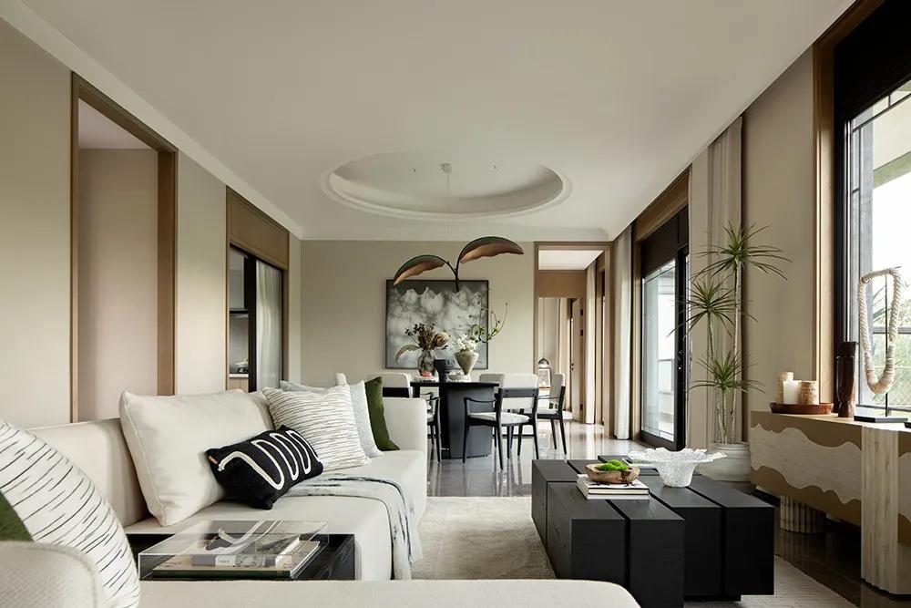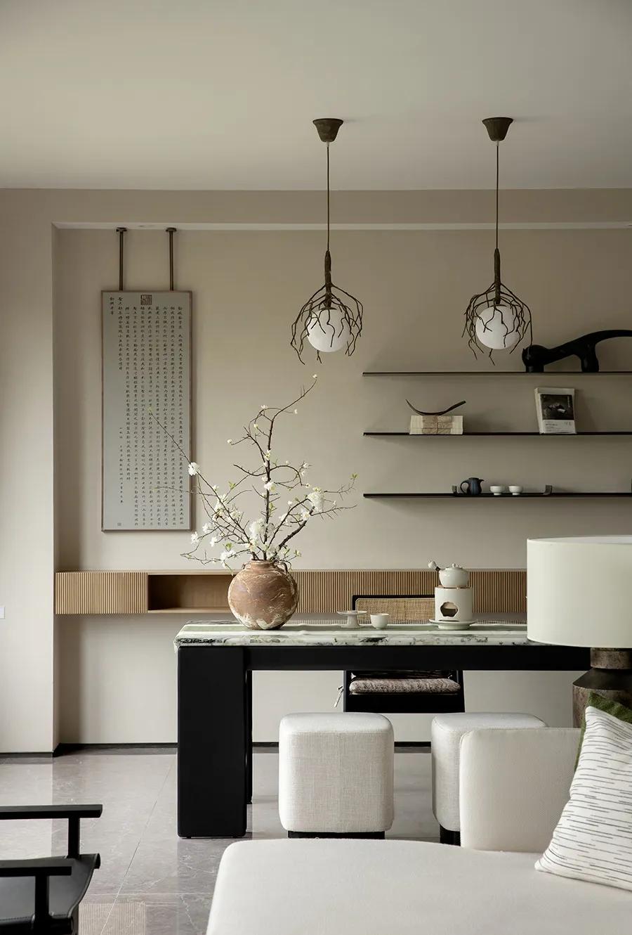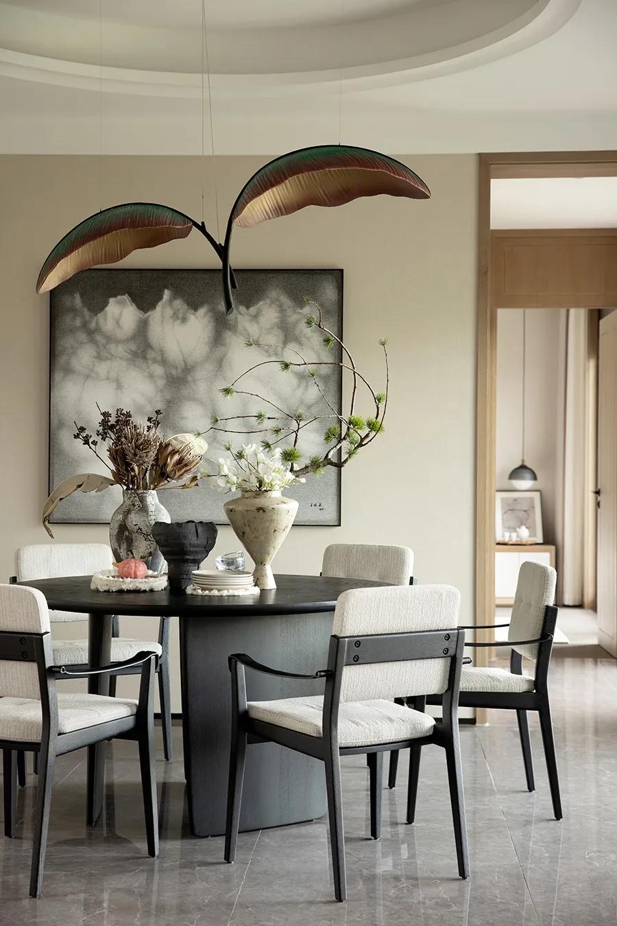 黑与白之中,零星点缀的绿色作为牵引,空间“活”了起来。正因如此,居者在正式的序列与松弛的意境之间找到了平衡。设计师将公共空间打造为一个多功能的社交场所,功能紧凑,但空间并不显局促,以客厅为核心,左右两侧分别是用餐区与品茗区,无不彰显着江南文人的清雅与品位。
